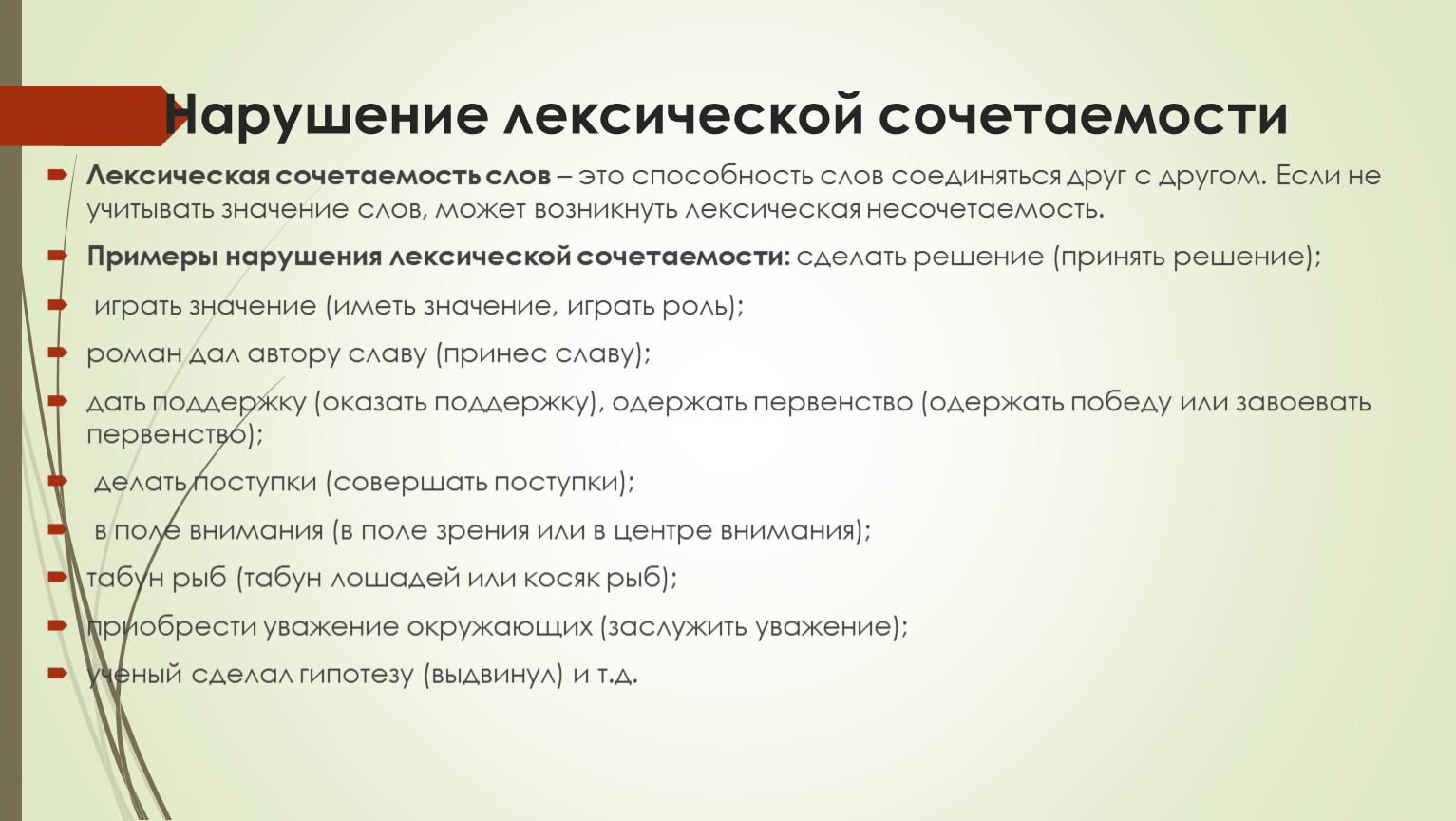 Лексическая сочетаемость слов – это способность слов соединяться друг с другом. Если не учитывать значение слов, может возникнуть лексическая несочетаемость.