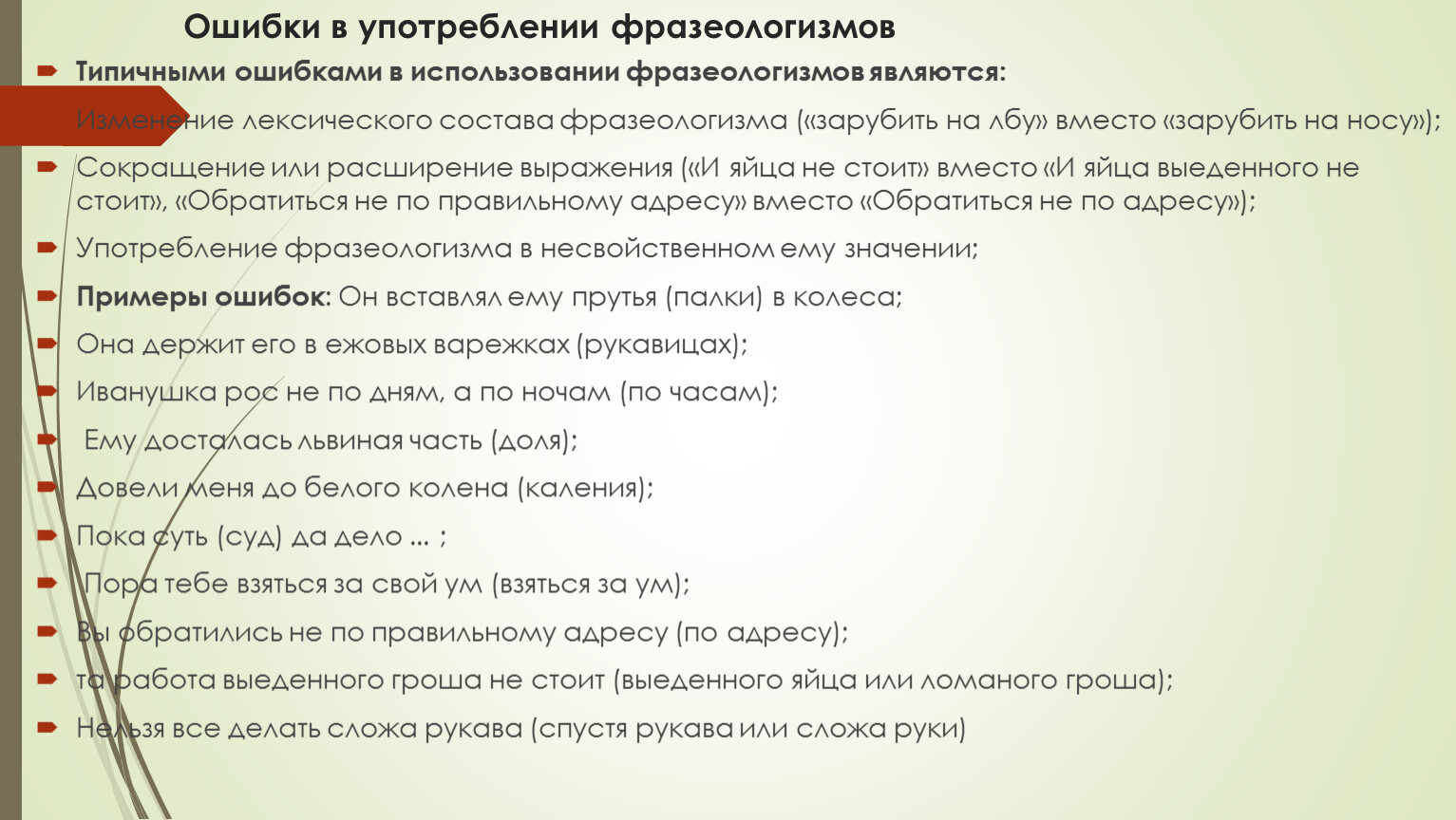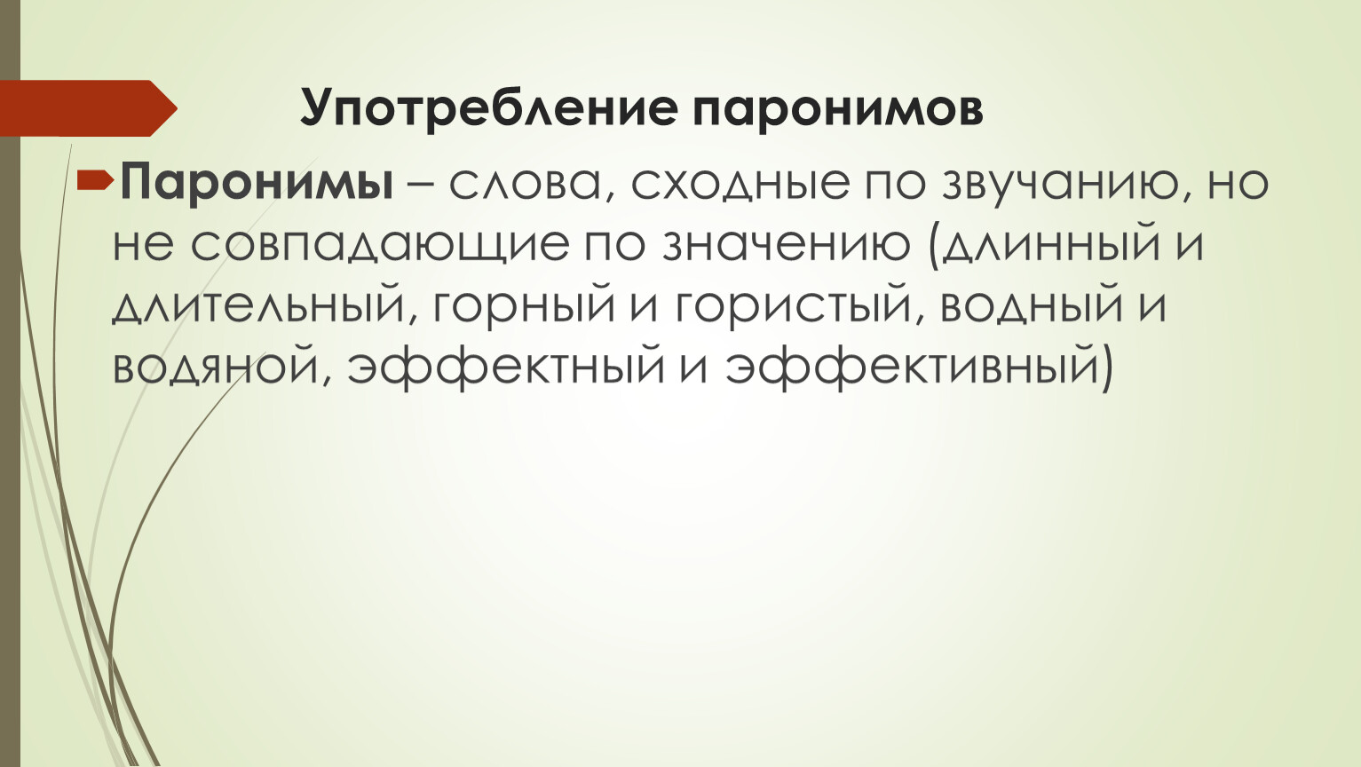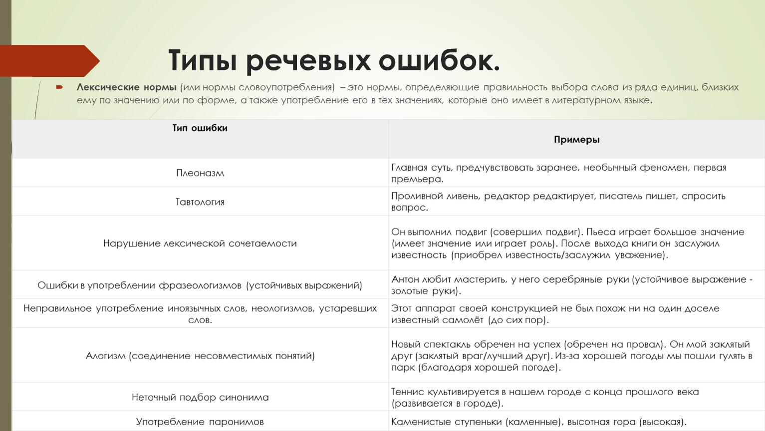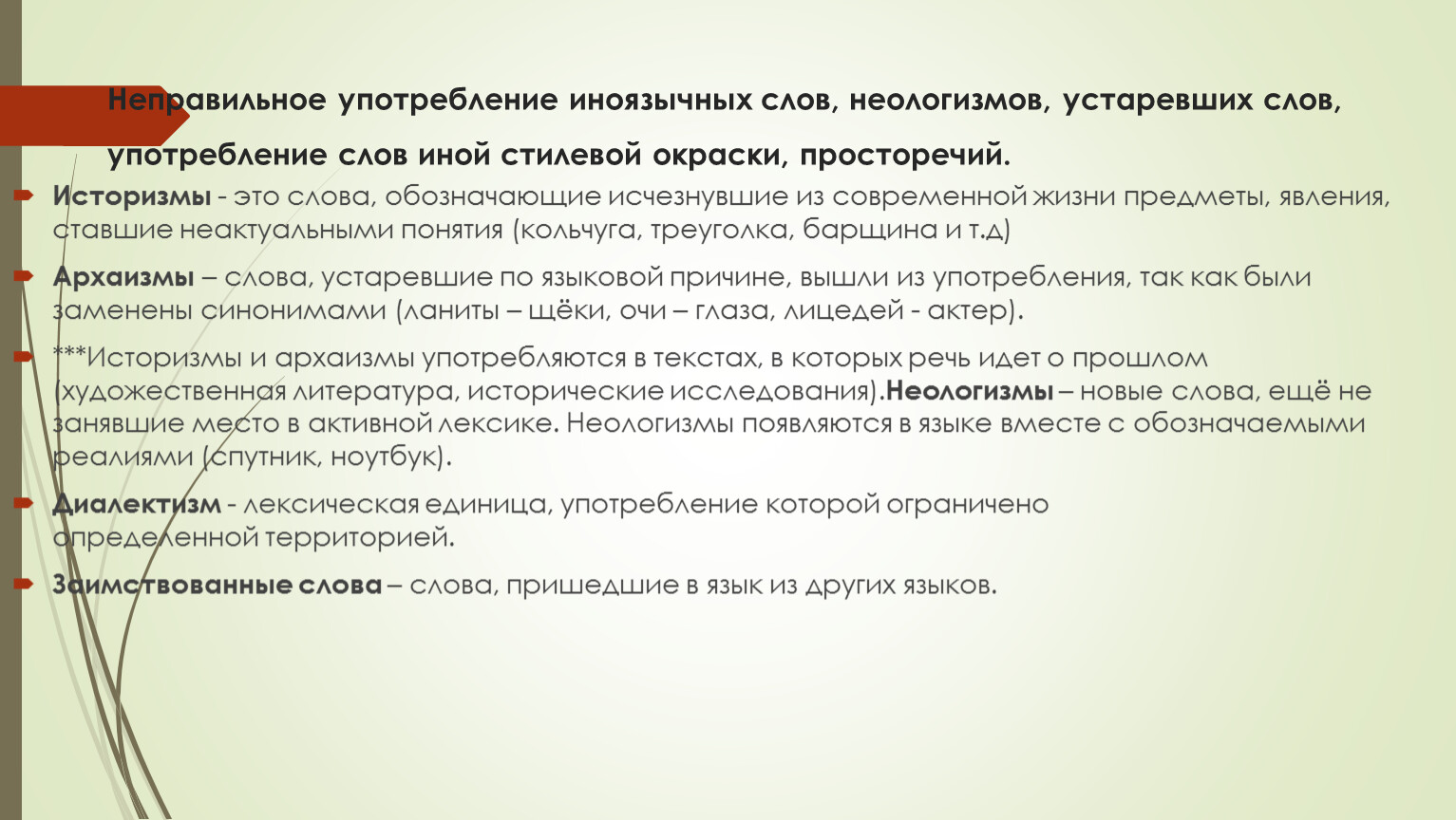 Неправильное употребление иноязычных слов, неологизмов, устаревших слов, употребление слов иной стилевой окраски, просторечий.
