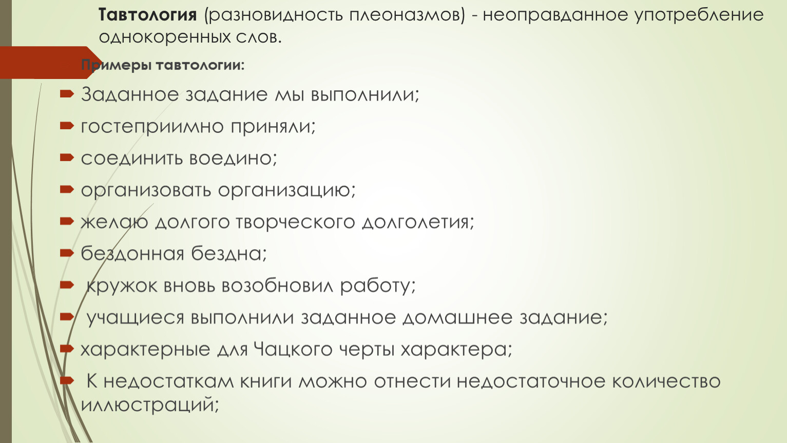 Тавтология (разновидность плеоназмов) - неоправданное употребление однокоренных слов.