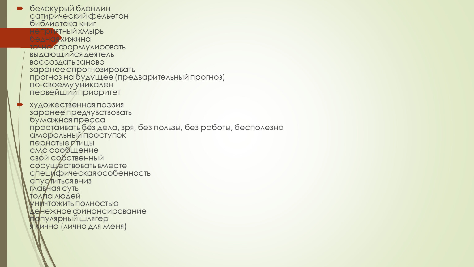 художественная поэзиязаранее предчувствоватьбумажная прессапростаивать без дела, зря, без пользы, без работы, бесполезноаморальный проступокпернатые птицысмс сообщениесвой собственныйсосуществовать вместеспецифическая особенностьспуститься внизглавная сутьтолпа людейуничтожить полностьюденежное финансированиепопулярный шлягеря лично (лично для меня)