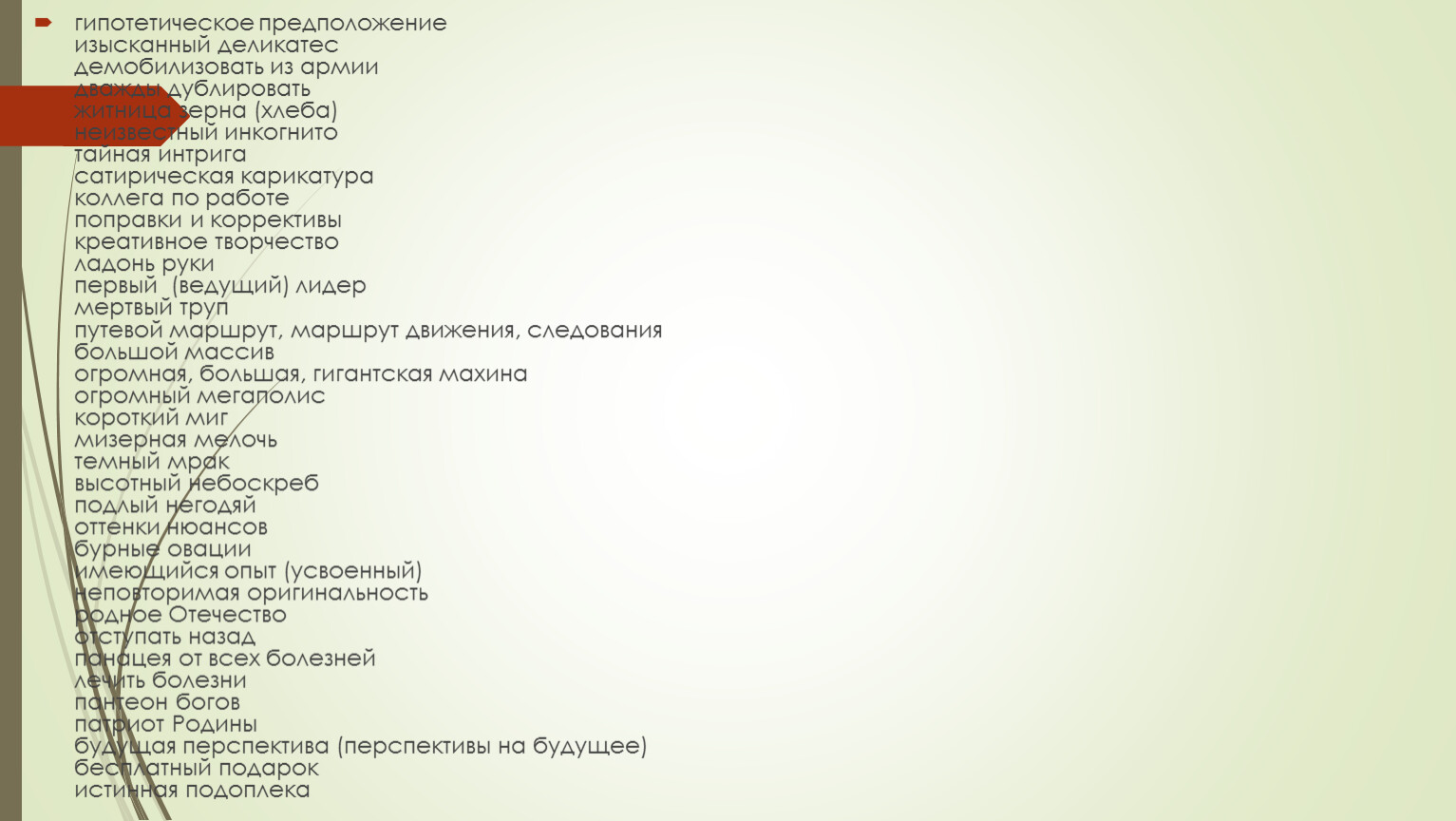 гипотетическое предположениеизысканный деликатесдемобилизовать из армиидважды дублироватьжитница зерна (хлеба)неизвестный инкогнитотайная интригасатирическая карикатураколлега по работепоправки и коррективыкреативное творчестволадонь рукипервый (ведущий) лидермертвый труппутевой маршрут, маршрут движения, следованиябольшой массивогромная, большая, гигантская махинаогромный мегаполискороткий мигмизерная мелочьтемный мраквысотный небоскребподлый негодяйоттенки нюансовбурные овацииимеющийся опыт (усвоенный)неповторимая оригинальностьродное Отечествоотступать назадпанацея от всех болезнейлечить болезнипантеон боговпатриот Родиныбудущая перспектива (перспективы на будущее)бесплатный подарокистинная подоплека