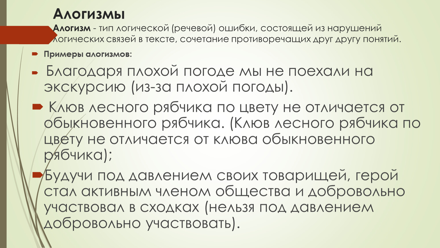 АлогизмыАлогизм - тип логической (речевой) ошибки, состоящей из нарушений логических связей в тексте, сочетание противоречащих друг другу понятий.