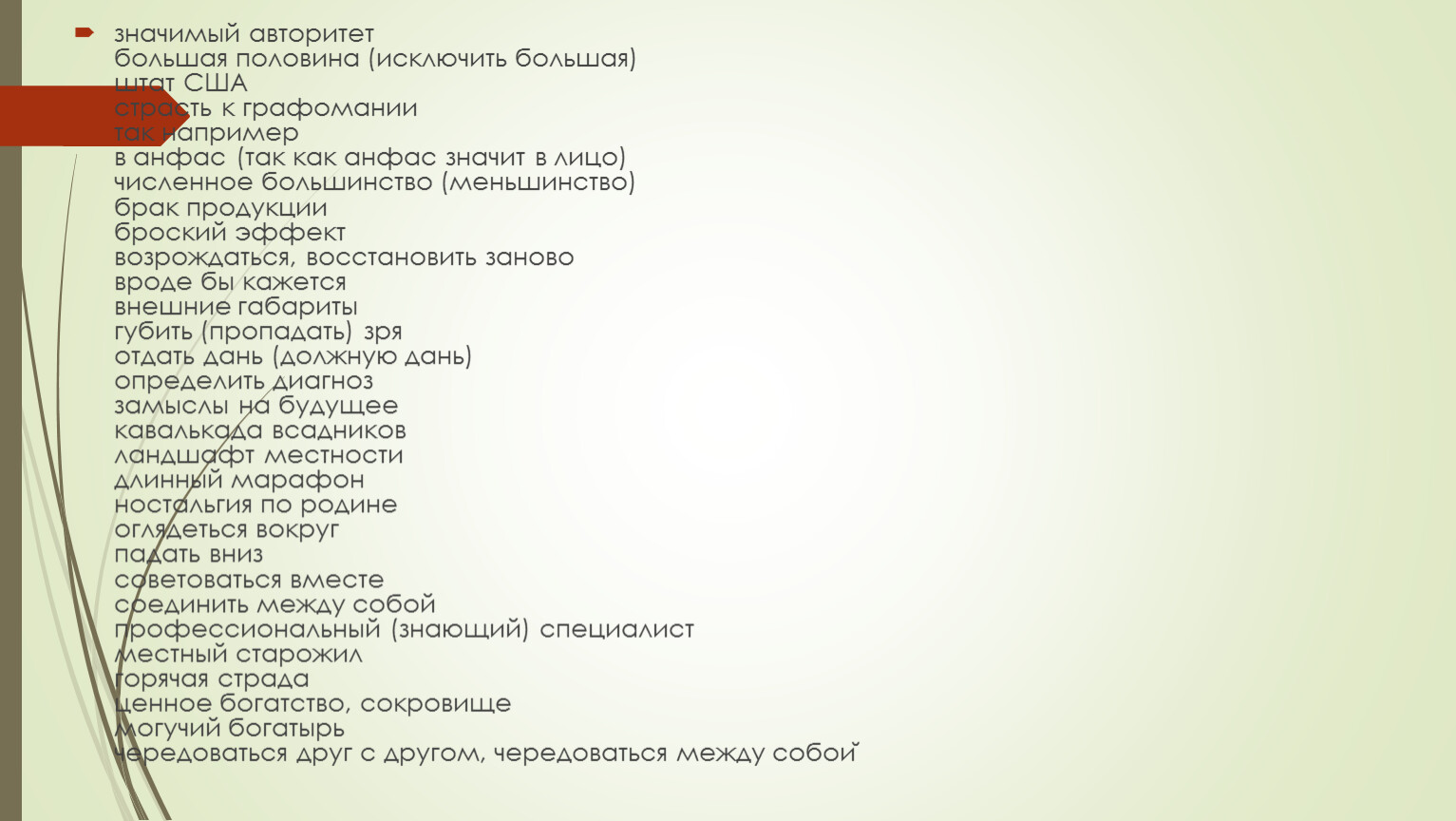 значимый авторитетбольшая половина (исключить большая)штат СШАстрасть к графоманиитак напримерв анфас (так как анфас значит в лицо)численное большинство (меньшинство)брак продукцииброский эффектвозрождаться, восстановить занововроде бы кажетсявнешние габаритыгубить (пропадать) зряотдать дань (должную дань)определить диагноззамыслы на будущеекавалькада всадниковландшафт местностидлинный марафонностальгия по родинеоглядеться вокругпадать внизсоветоваться вместесоединить между собойпрофессиональный (знающий) специалистместный старожилгорячая страдаценное богатство, сокровищемогучий богатырьчередоваться друг с другом, чередоваться между собой