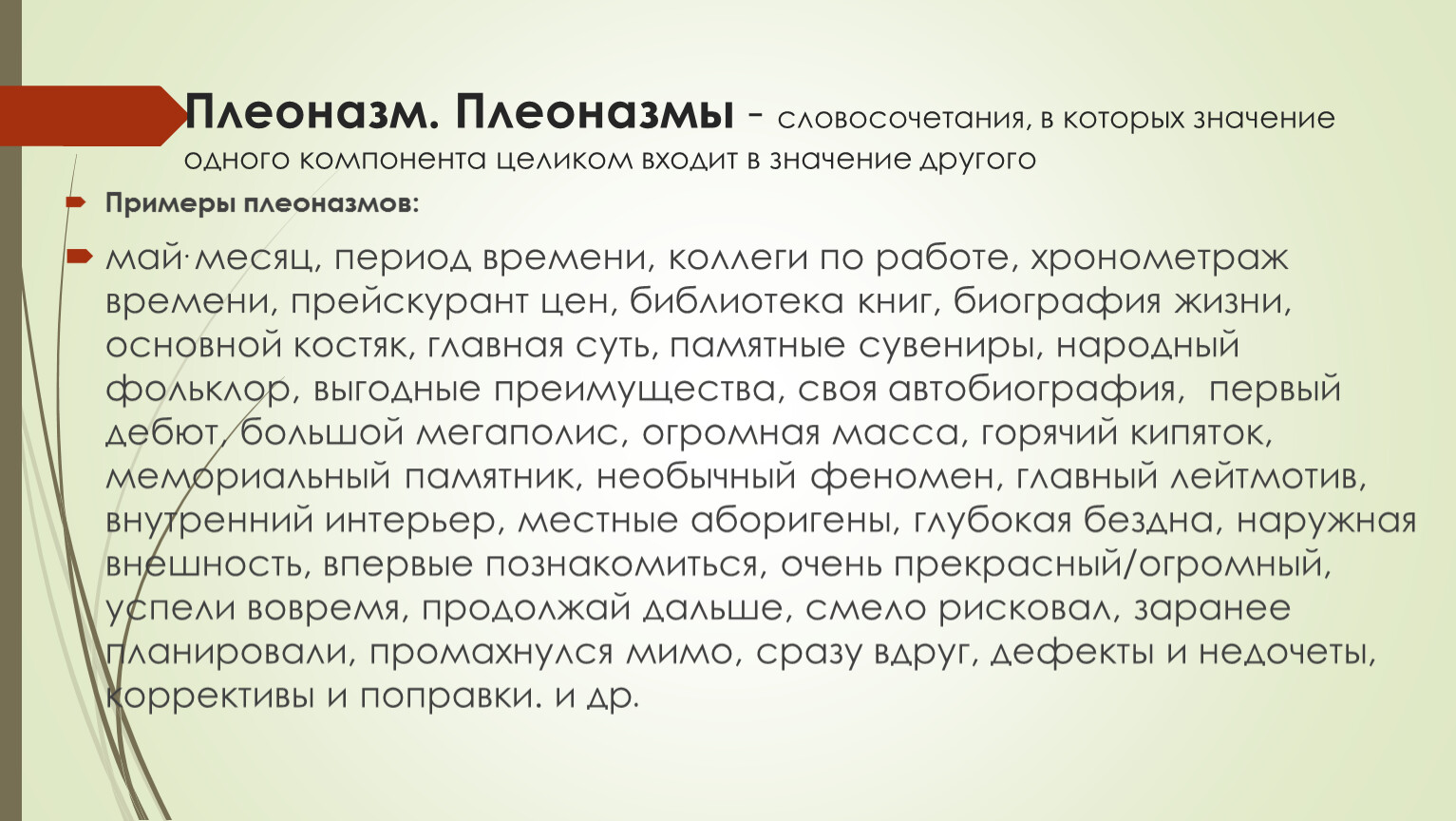 Плеоназм. Плеоназмы - словосочетания, в которых значение одного компонента целиком входит в значение другого.