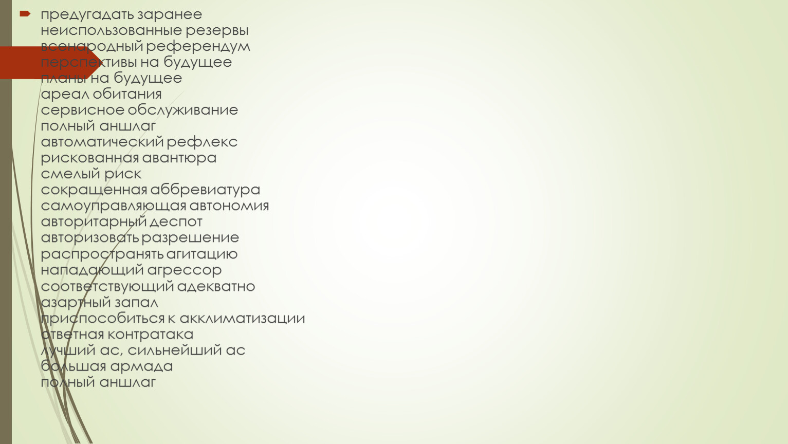 предугадать заранеенеиспользованные резервывсенародный референдумперспективы на будущеепланы на будущееареал обитаниясервисное обслуживаниеполный аншлагавтоматический рефлексрискованная авантюрасмелый рисксокращенная аббревиатурасамоуправляющая автономияавторитарный деспотавторизовать разрешениераспространять агитациюнападающий агрессорсоответствующий адекватноазартный запалприспособиться к акклиматизацииответная контратакалучший ас, сильнейший асбольшая армадаполный аншлаг