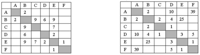 1. Между населёнными пунктами A, B, C, D, E, F построены дороги, протяжённость которых приведена в таблице. (Отсутствие числа в таблице означает, что прямой дороги между пунктами нет.) Определите длину кратчайшего пути между пунктами A и F (при условии, что передвигаться можно только по построенным дорогам).