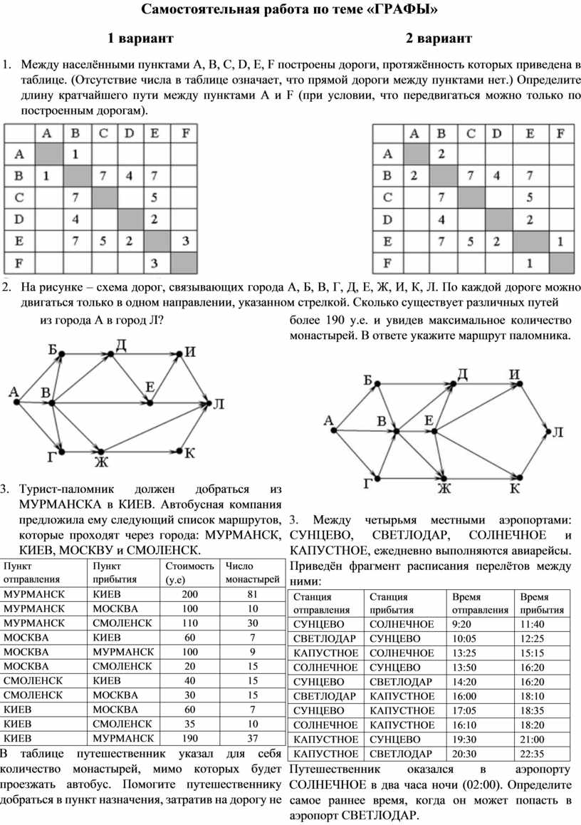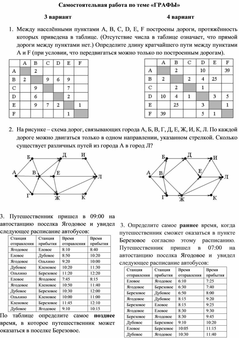 Самостоятельная работа по теме «ГРАФЫ» 3 вариант 4 вариант 1. Между населёнными пунктами A, B, C, D, E, F построены дороги, протяжённость которых приведена в таблице. (Отсутствие числа в таблице означает, что прямой дороги между пунктами нет.) Определите длину кратчайшего пути между пунктами A и F (при условии, что передвигаться можно только по построенным дорогам).