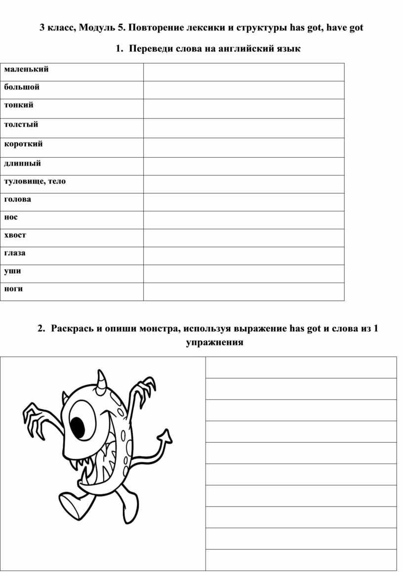 3. Раскрась и опиши монстра, используя выражение has got и слова из 1 упражнения