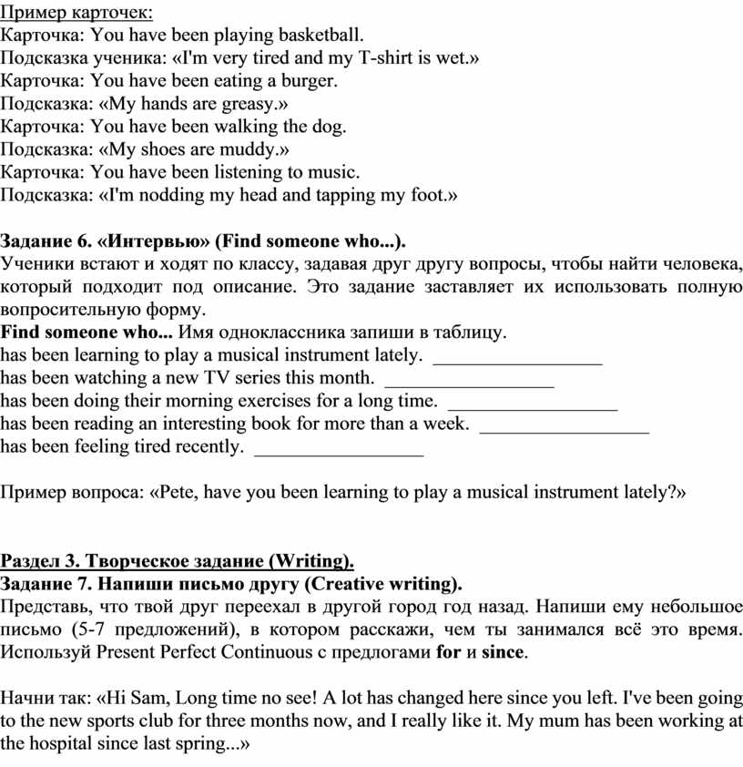 Представь, что твой друг переехал в другой город год назад. Напиши ему небольшое письмо (5-7 предложений), в котором расскажи, чем ты занимался всё это время. Используй Present Perfect Continuous с предлогами for и since.