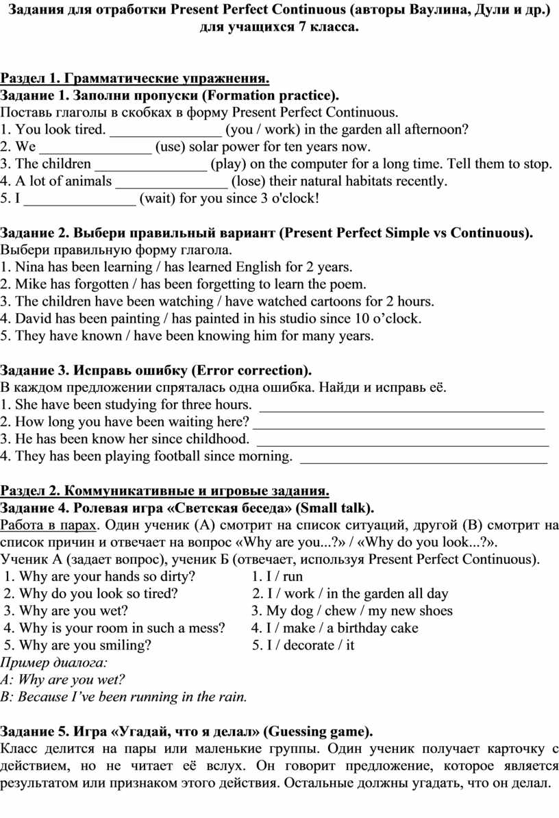 Задания для отработки Present Perfect Continuous (авторы Ваулина, Дули и др.) для учащихся 7 класса.