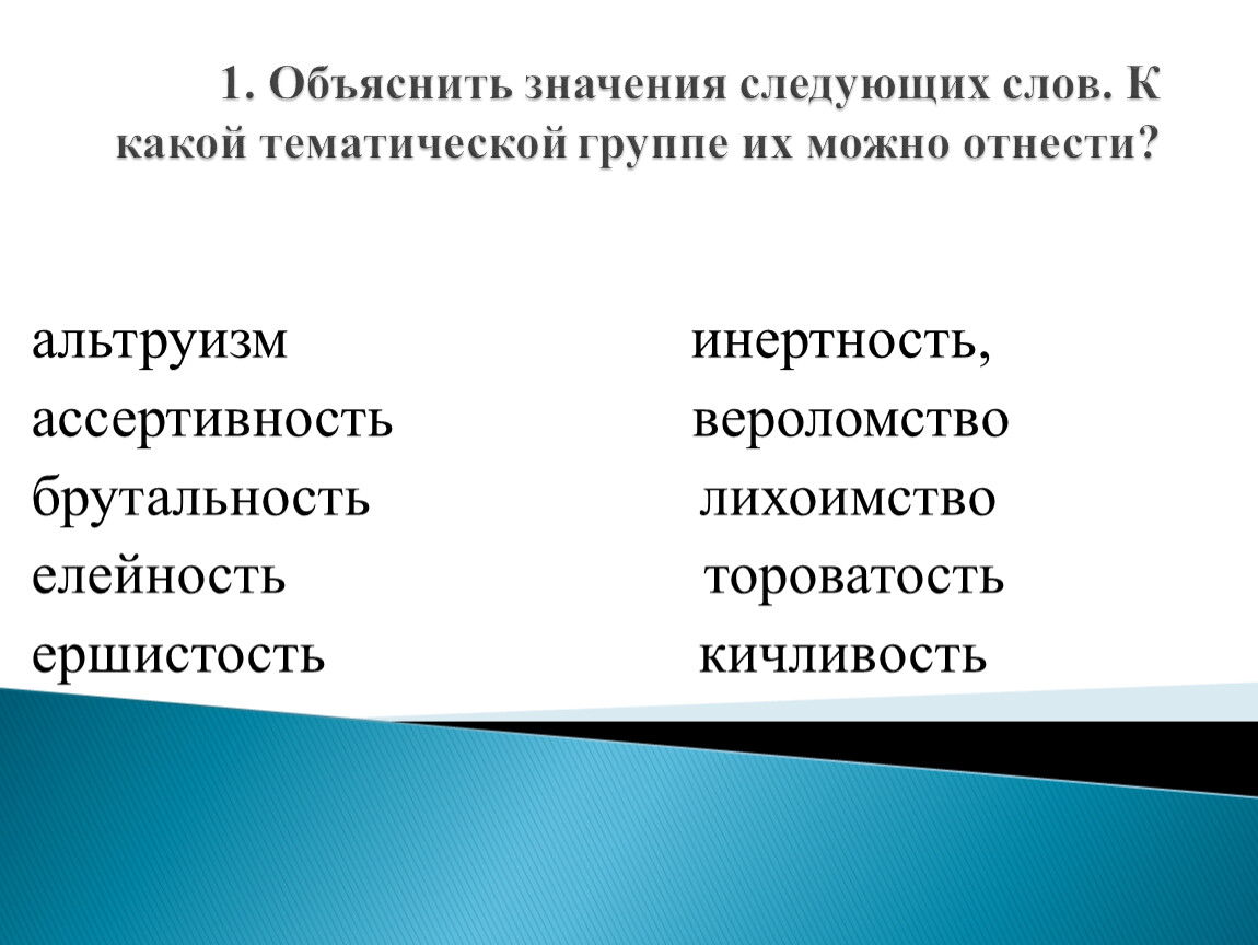 1. Объяснить значения следующих слов. К какой тематической группе их можно отнести?