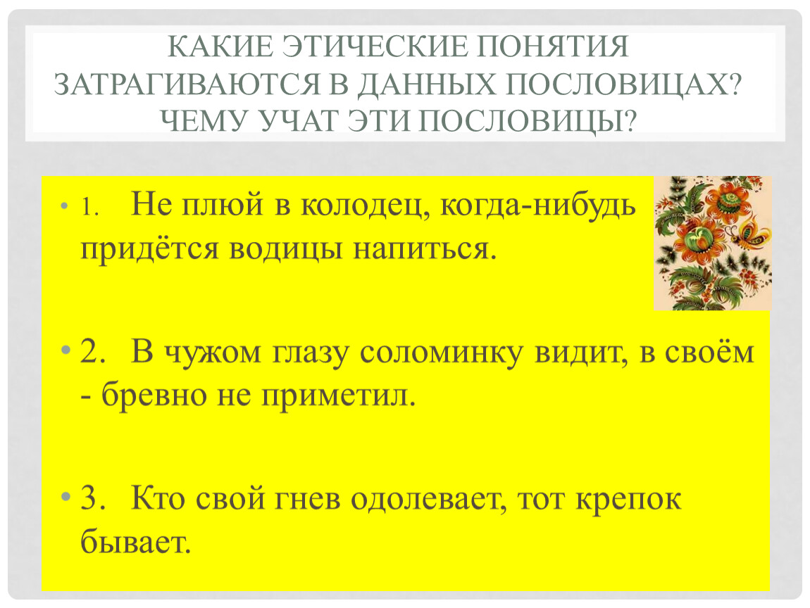 Какие этические понятия затрагиваются в данных пословицах?Чему учат эти пословицы?