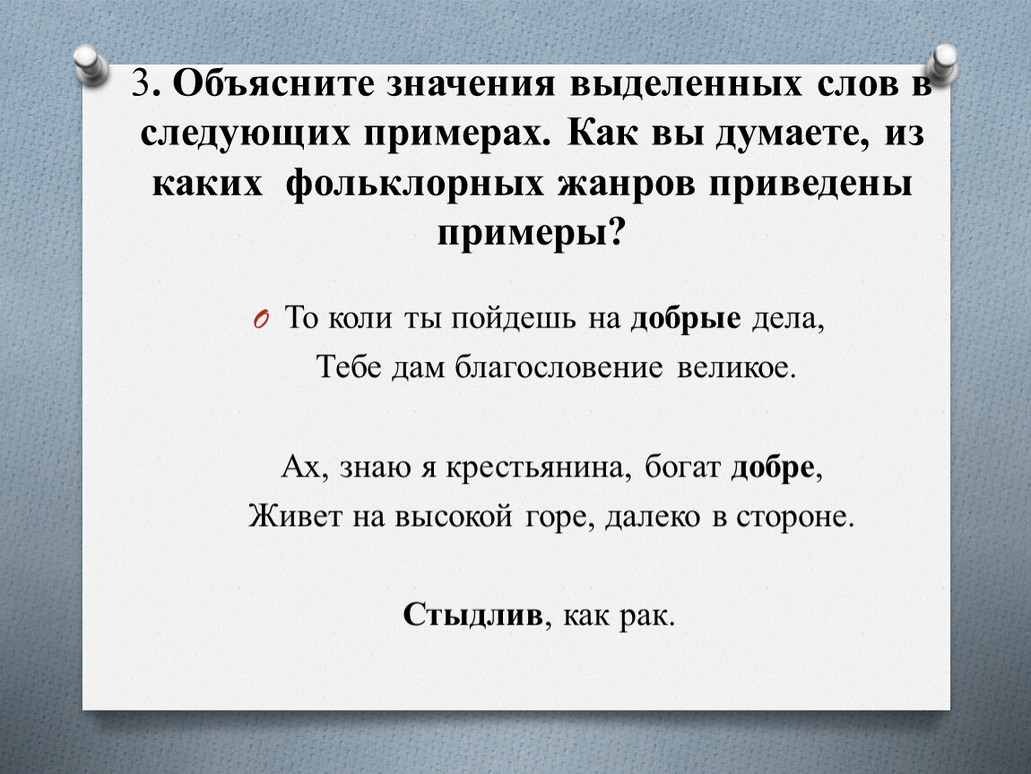 3. Объясните значения выделенных слов в следующих примерах. Как вы думаете, из каких фольклорных жанров приведены примеры?