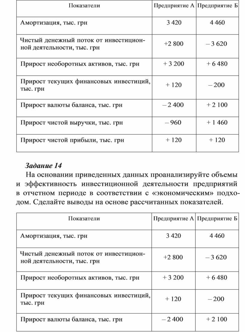 На основании приведенных данных проанализируйте объемы и эффективность инвестиционной деятельности предприятий в отчетном периоде в соответствии с «экономическим» подхо- дом. Сделайте выводы на основе рассчитанных показателей.