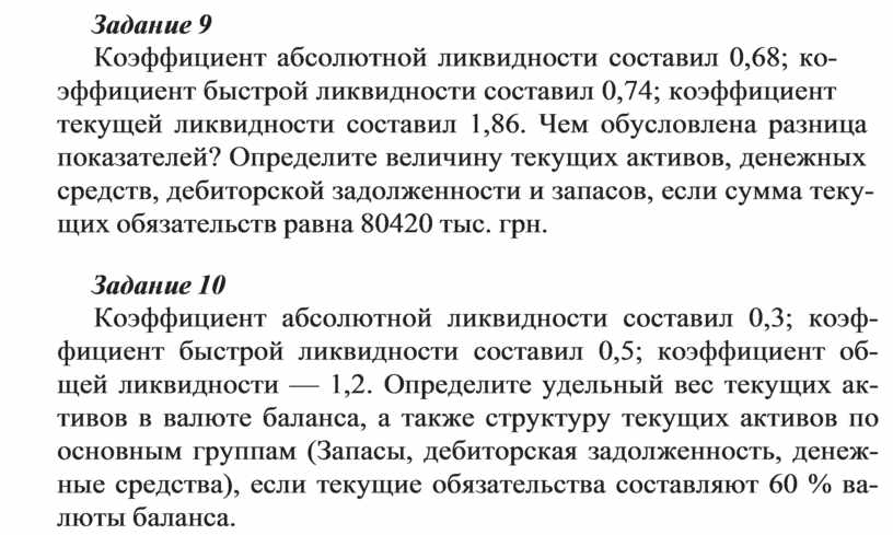 Коэффициент абсолютной ликвидности составил 0,68; ко- эффициент быстрой ликвидности составил 0,74; коэффициент текущей ликвидности составил 1,86. Чем обусловлена разница показателей? Определите величину текущих активов, денежных средств, дебиторской задолженности и запасов, если сумма теку- щих обязательств равна 80420 тыс. грн.