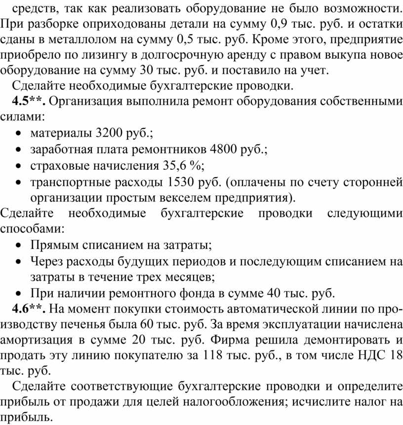 4.6**. На момент покупки стоимость автоматической линии по производству печенья была 60 тыс. руб. За время эксплуатации начислена амортизация в сумме 20 тыс. руб. Фирма решила демонтировать и продать эту линию покупателю за 118 тыс. руб., в том числе НДС 18 тыс. руб.