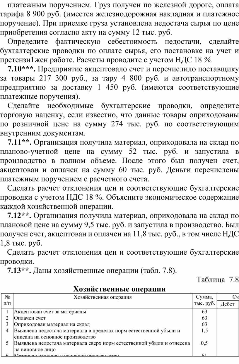 7.2***. Предприятием, согласно договору, предварительно оплачено сырье на сумму 236 тыс. руб., в том числе НДС 36 тыс. руб. (платежное поручение). Груз получен по железной дороге, оплата железнодорожного тарифа обошлась в 11,8 тыс. руб., в том числе НДС 1,8 тыс. руб. (железнодорожная накладная, платежное поручение). При приемке груза установлена недостача сырья по цене приобретения на сумму 35,4 тыс. руб., в том числе НДС 5,4 тыс. руб.
