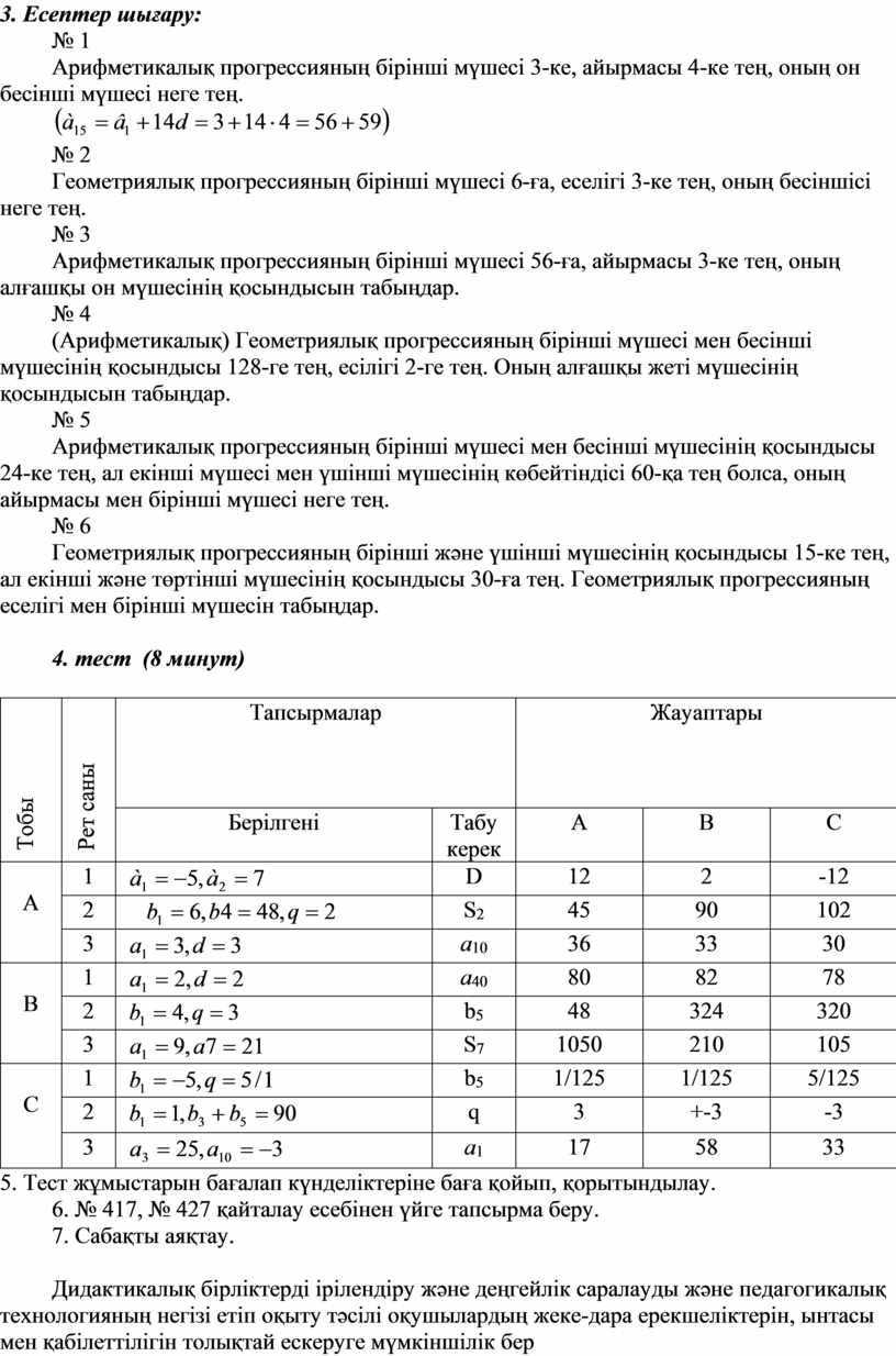 Арифметикалық, геометриялық прогрессияның анықтамасын меңгеріп, n-ші мүшенің және алғашқы n мүшесінің қосындысының формуласын меңгеріп, есептер шығаруға қолдана білу.