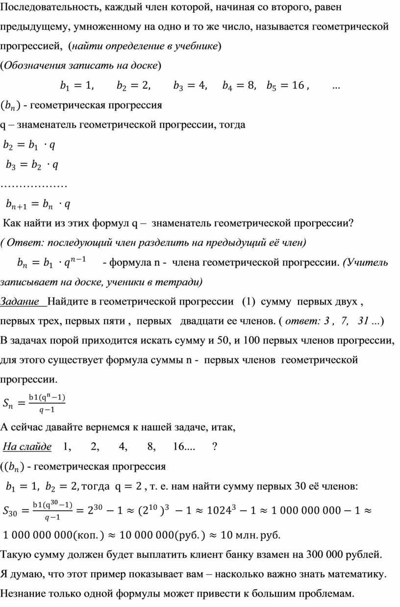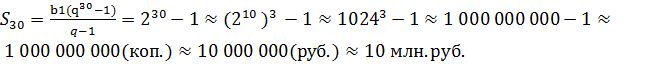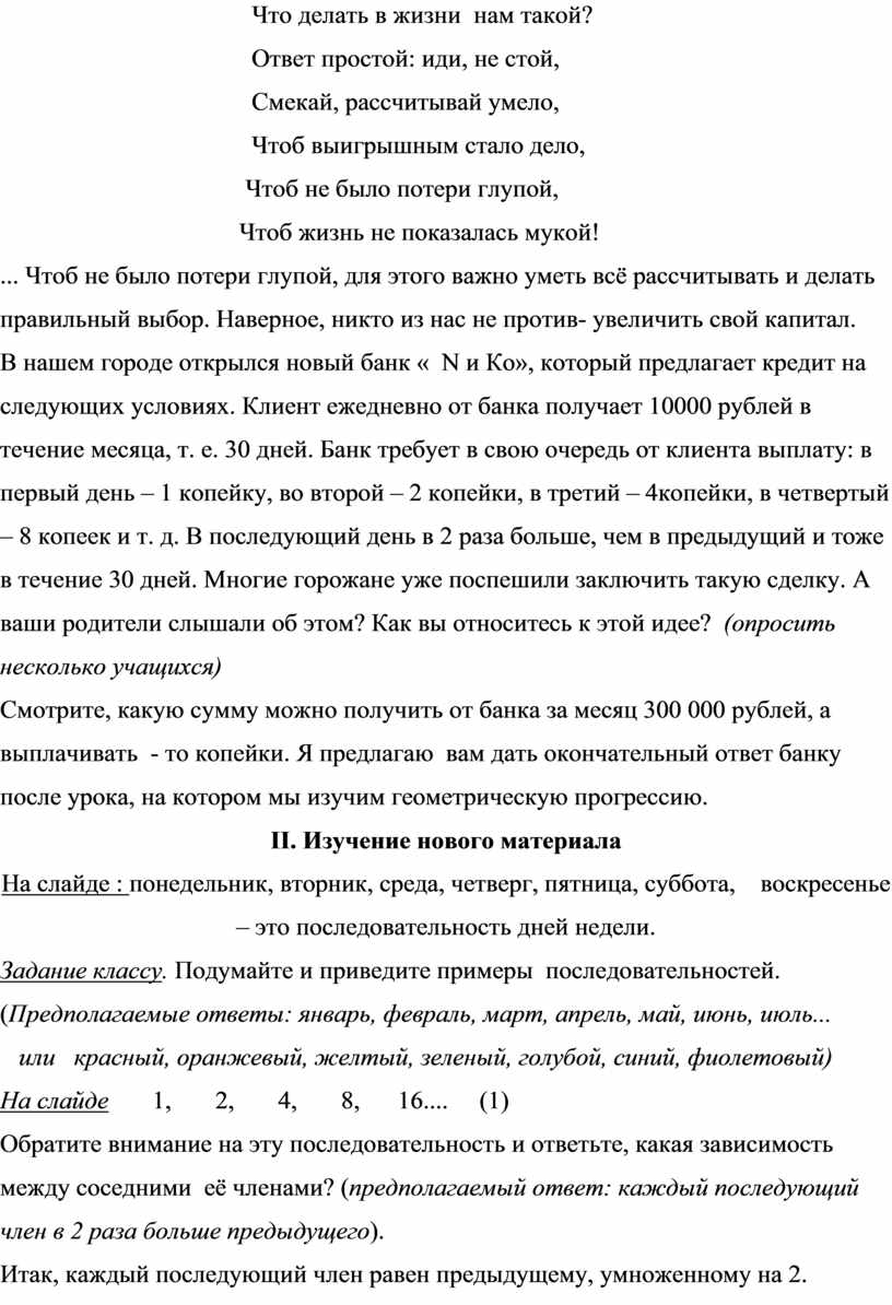 В нашем городе открылся новый банк « N и Ко», который предлагает кредит на следующих условиях. Клиент ежедневно от банка получает 10000 рублей в течение месяца, т. е. 30 дней. Банк требует в свою очередь от клиента выплату: в первый день – 1 копейку, во второй – 2 копейки, в третий – 4копейки, в четвертый – 8 копеек и т. д. В последующий день в 2 раза больше, чем в предыдущий и тоже в течение 30 дней. Многие горожане уже поспешили заключить такую сделку. А ваши родители слышали об этом? Как вы относитесь к этой идее? (опросить несколько учащихся)