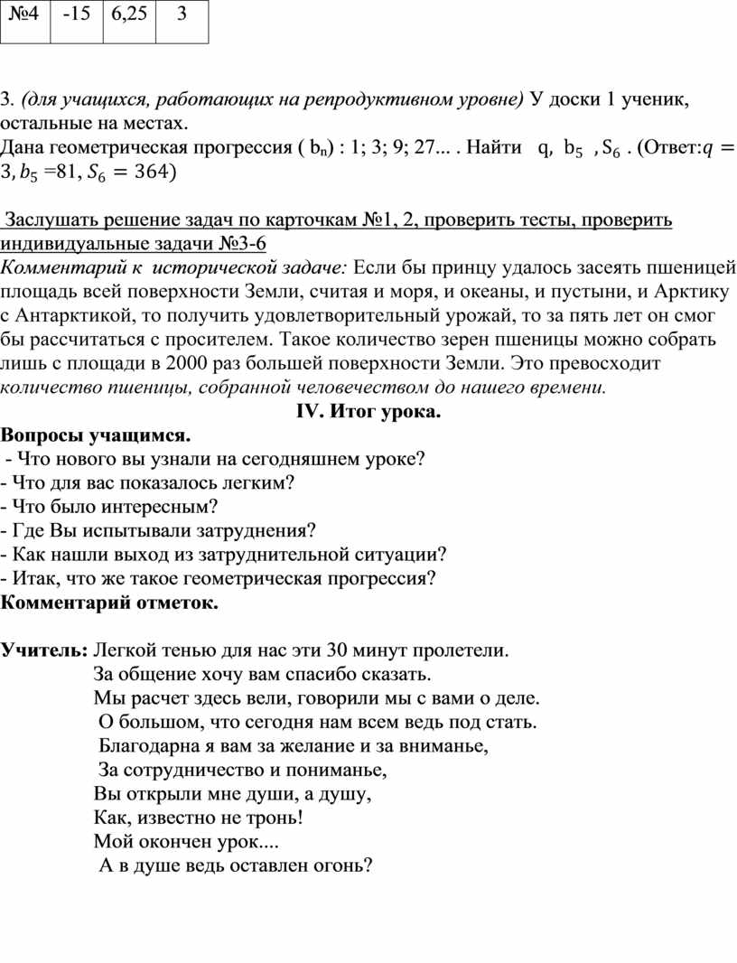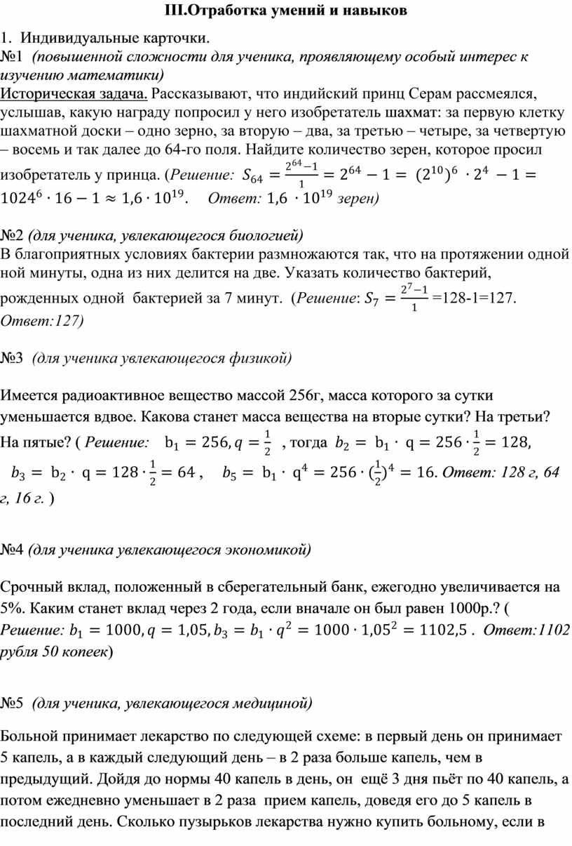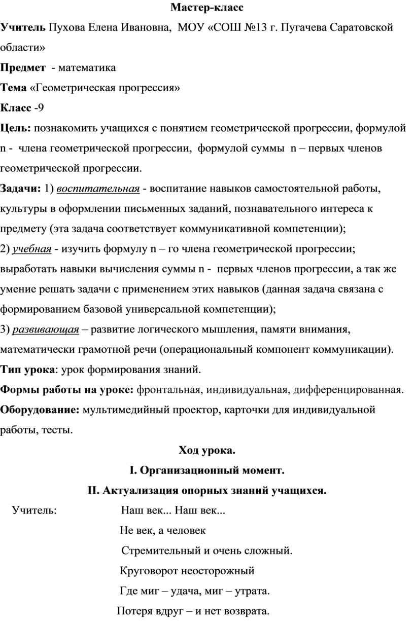 2) учебная - изучить формулу n – го члена геометрической прогрессии; выработать навыки вычисления суммы n - первых членов прогрессии, а так же умение решать задачи с применением этих навыков (данная задача связана с формированием базовой универсальной компетенции);