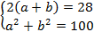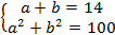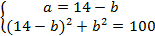 196 – 28 b +b2 +b2 =100 2b2 - 28b + 96 =0 b2 - 14b + 48 =0 b1 =6 b2 = 8 a1 =14 - 6 = 8 a2 = 14 - 8 = 6 Ответ: (8;6), (6;8) Задача для самостоятельного решения в группе №7.2