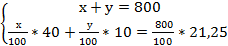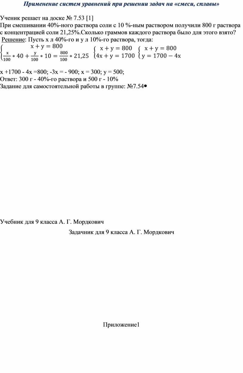 Ученик решает на доске № 7.53 [1] При смешивании 40%-ного раствора соли с 10 %-ным раствором получили 800 г раствора с концентрацией соли 21,25%.Сколько граммов каждого раствора было для этого взято? Решение: Пусть х л 40%-го и у л 10%-го раствора, тогда:
