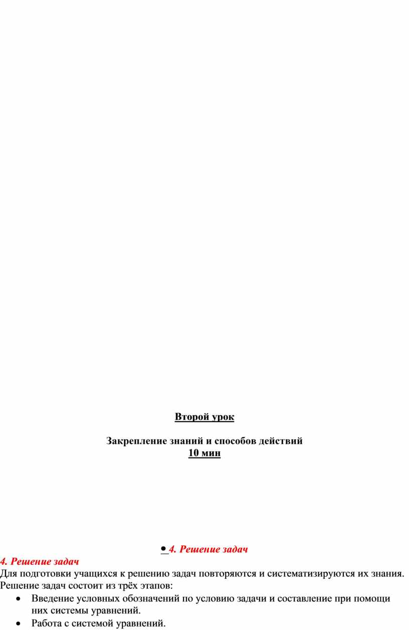 4. Решение задач Для подготовки учащихся к решению задач повторяются и систематизируются их знания. Решение задач состоит из трёх этапов: · Введение условных обозначений по условию задачи и составление при помощи них системы уравнений. · Работа с системой уравнений. · Ответ на вопрос задачи. Каждый из этих этапов является важным в решении задачи.