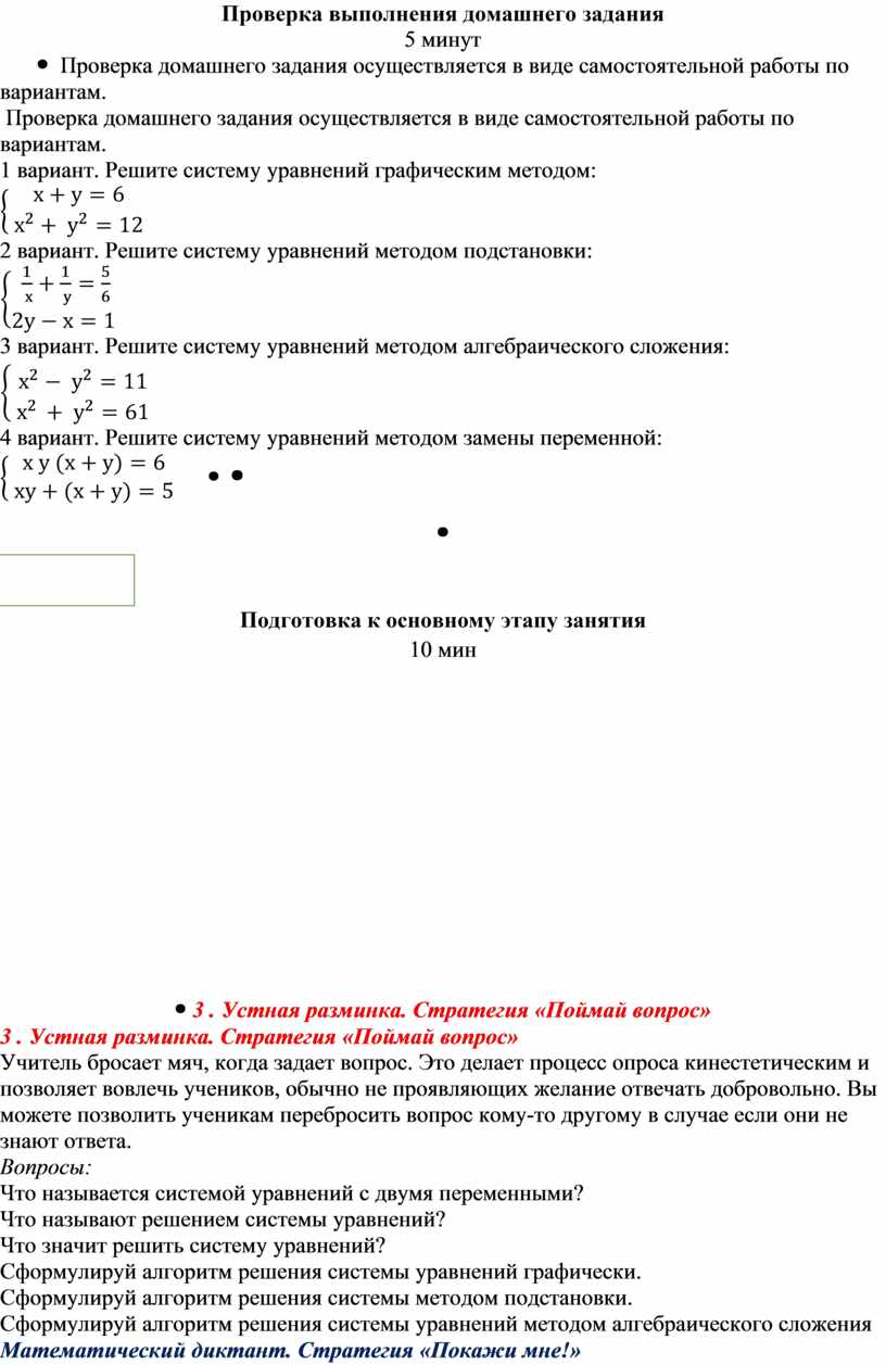 3 . Устная разминка. Стратегия «Поймай вопрос» Учитель бросает мяч, когда задает вопрос. Это делает процесс опроса кинестетическим и позволяет вовлечь учеников, обычно не проявляющих желание отвечать добровольно. Вы можете позволить ученикам перебросить вопрос кому-то другому в случае если они не знают ответа. Вопросы: Что называется системой уравнений с двумя переменными? Что называют решением системы уравнений? Что значит решить систему уравнений? Сформулируй алгоритм решения системы уравнений графически. Сформулируй алгоритм решения системы методом подстановки. Сформулируй алгоритм решения системы уравнений методом алгебраического сложения Математический диктант. Стратегия «Покажи мне!» Ученикам предлагаются 5 заданий, для которых надо составить уравнение с двумя переменными. Когда учитель досчитает до 3-х, ученики должны поднять свои листочки с верным ответом для каждого конкретного задания.