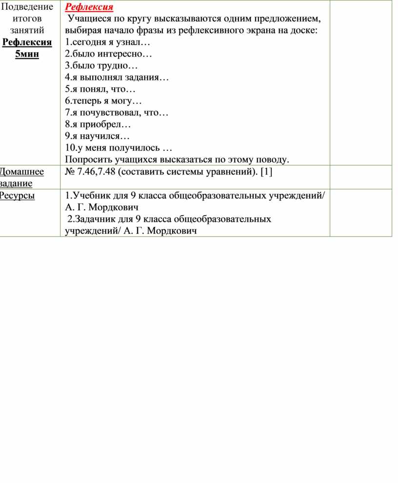 Рефлексия Учащиеся по кругу высказываются одним предложением, выбирая начало фразы из рефлексивного экрана на доске: 1.сегодня я узнал… 2.было интересно… 3.было трудно… 4.я выполнял задания… 5.я понял, что… 6.теперь я могу… 7.я почувствовал, что… 8.я приобрел… 9.я научился… 10.у меня получилось … Попросить учащихся высказаться по этому поводу. |