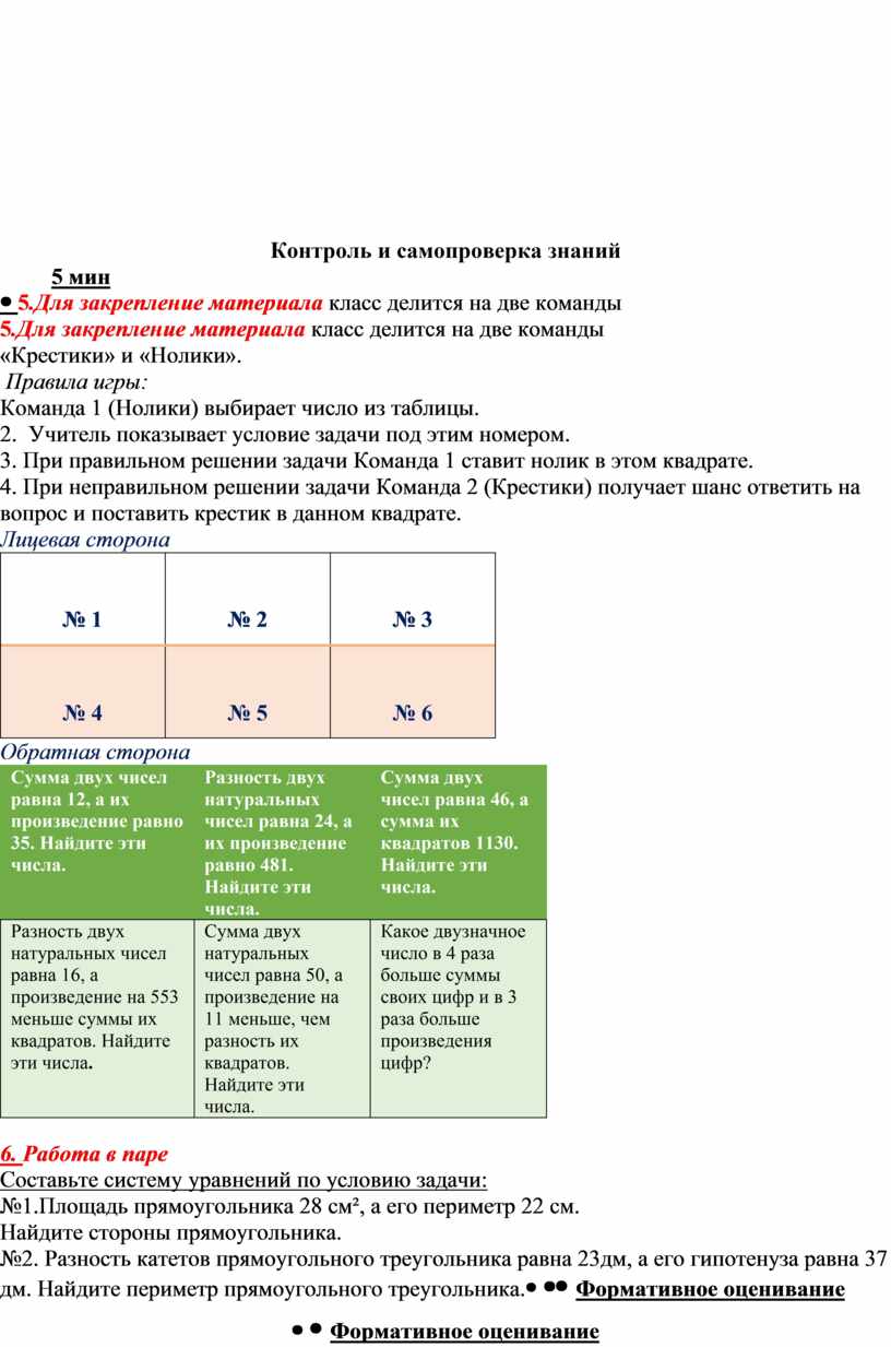 5.Для закрепление материала класс делится на две команды «Крестики» и «Нолики». Правила игры: Команда 1 (Нолики) выбирает число из таблицы. 2. Учитель показывает условие задачи под этим номером. 3. При правильном решении задачи Команда 1 ставит нолик в этом квадрате. 4. При неправильном решении задачи Команда 2 (Крестики) получает шанс ответить на вопрос и поставить крестик в данном квадрате. Лицевая сторона