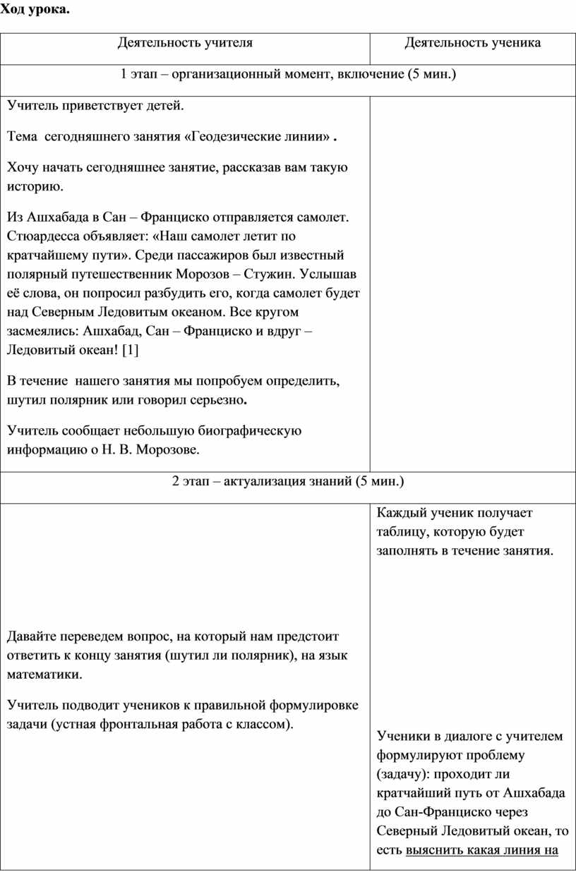 Ученики в диалоге с учителем формулируют проблему (задачу): проходит ли кратчайший путь от Ашхабада до Сан-Франциско через Северный Ледовитый океан, то есть выяснить какая линия на сфере и других поверхностях является кратчайшим расстоянием между двумя точками.