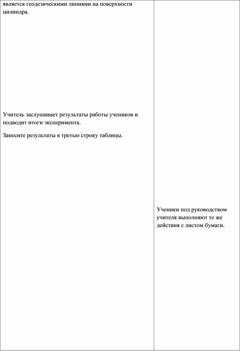 Ученики изготавливают развертку прямого кругового цилиндра и опытным путем выясняют, какие линии являются геодезическими на данной поверхности (самостоятельная работа).