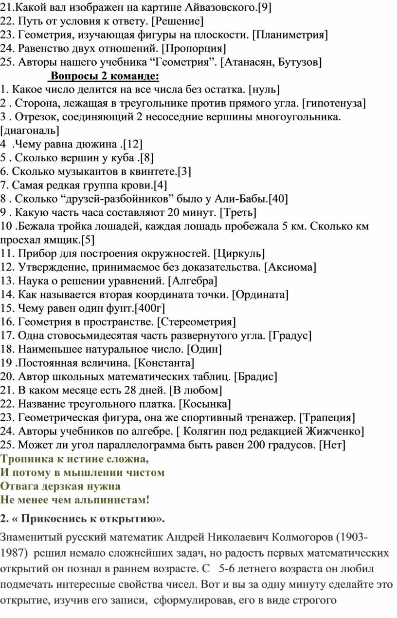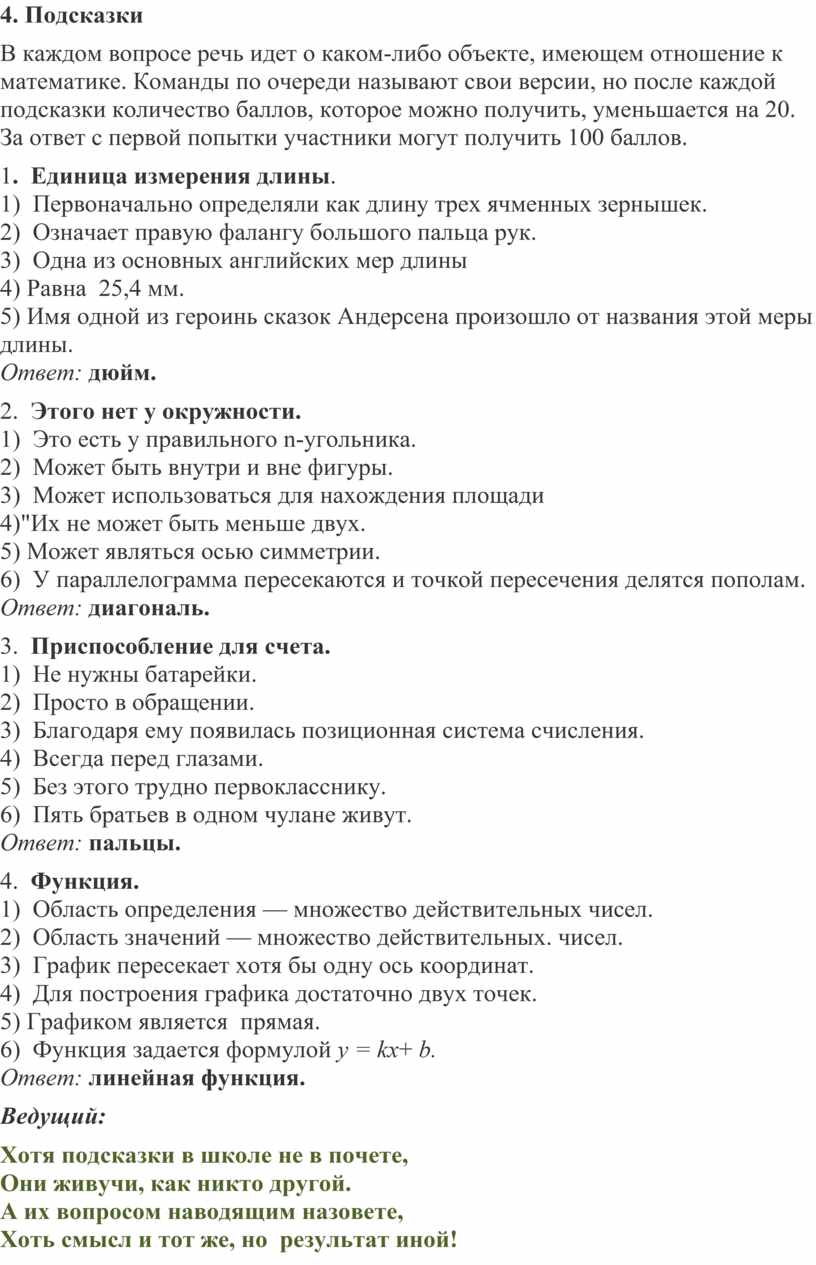 В каждом вопросе речь идет о каком-либо объекте, имеющем отношение к математике. Команды по очереди называют свои версии, но после каждой подсказки количество баллов, которое можно получить, уменьшается на 20. За ответ с первой попытки участники могут получить 100 баллов.