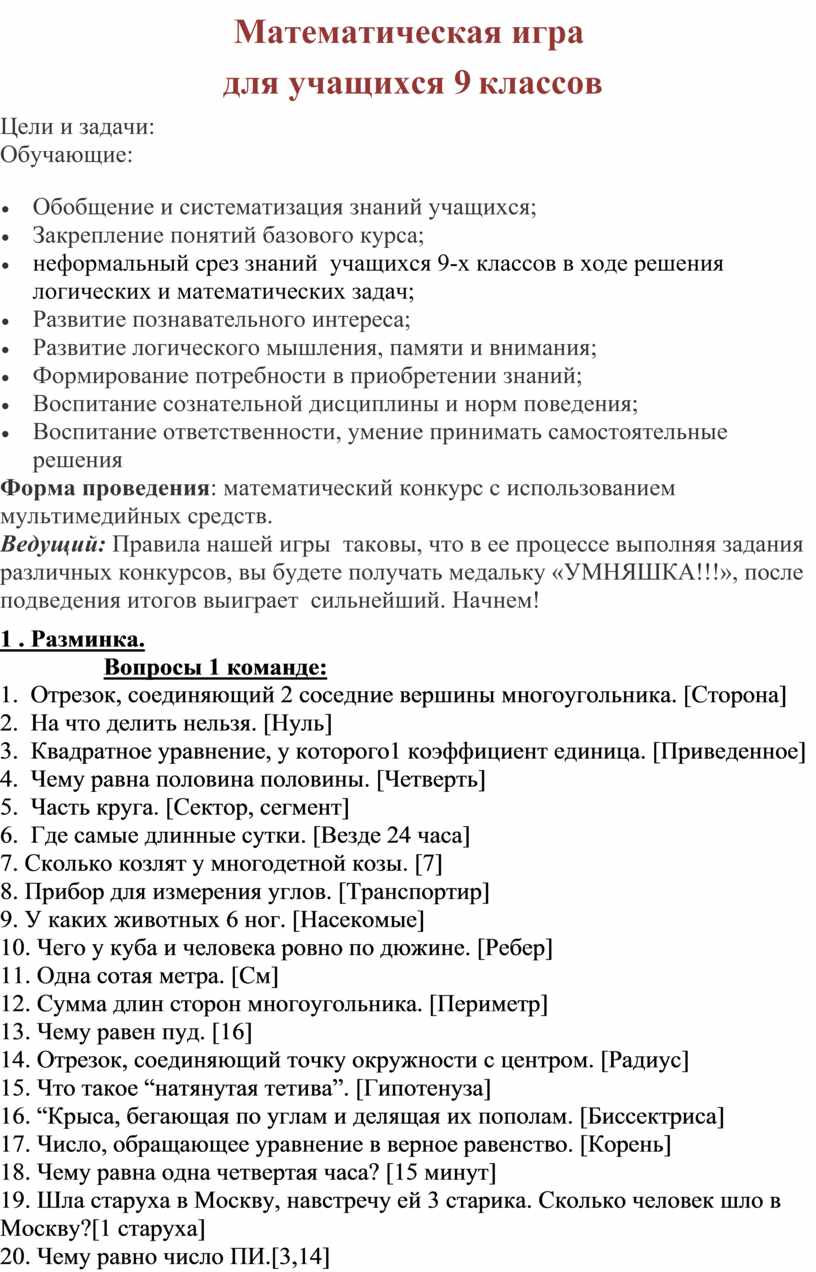 Форма проведения: математический конкурс с использованием мультимедийных средств.