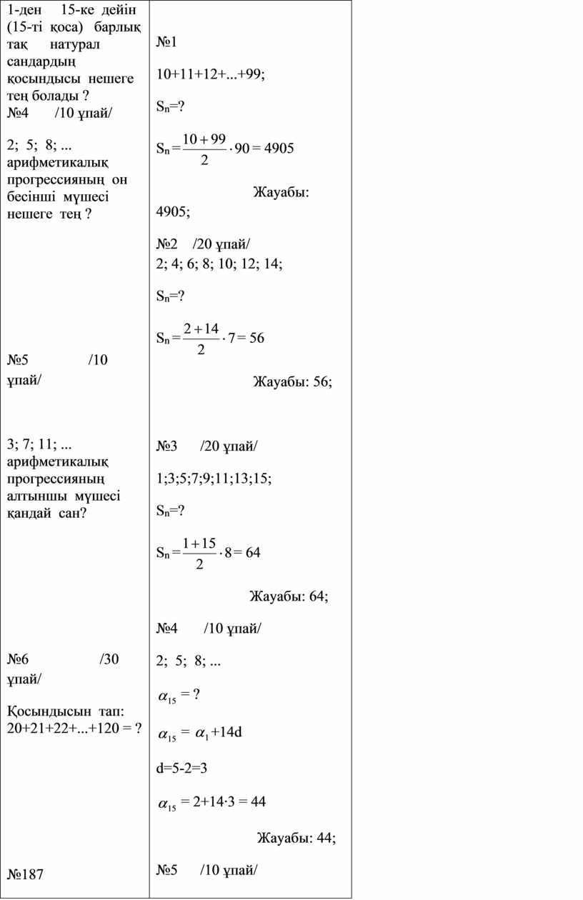 №3 /20 ұпай/ 1-ден 15-ке дейін (15-ті қоса) барлық тақ натурал сандардың қосындысы нешеге тең болады ? №4 /10 ұпай/ 2; 5; 8; ... арифметикалық прогрессияның он бесінші мүшесі нешеге тең ?