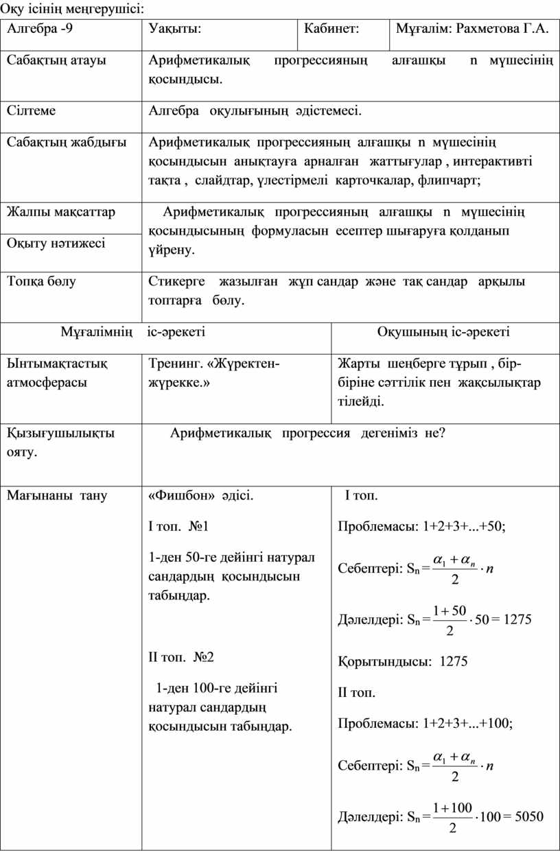 Тақырыбы: «Арифметикалық прогрессияның алғашқы n мүшесінің қосындысы.»