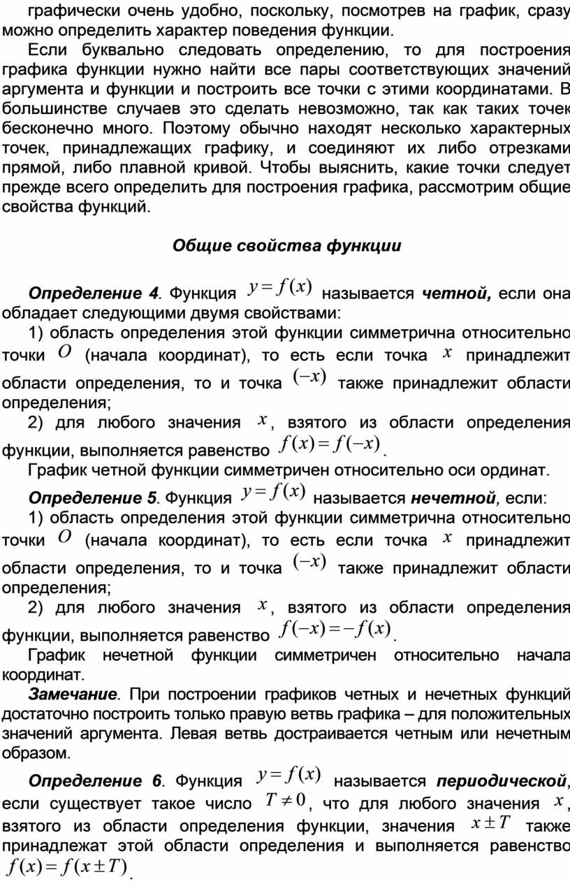 Если буквально следовать определению, то для построения графика функции нужно найти все пары соответствующих значений аргумента и функции и построить все точки с этими координатами. В большинстве случаев это сделать невозможно, так как таких точек бесконечно много. Поэтому обычно находят несколько характерных точек, принадлежащих графику, и соединяют их либо отрезками прямой, либо плавной кривой. Чтобы выяснить, какие точки следует прежде всего определить для построения графика, рассмотрим общие свойства функций.