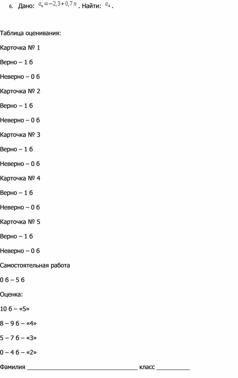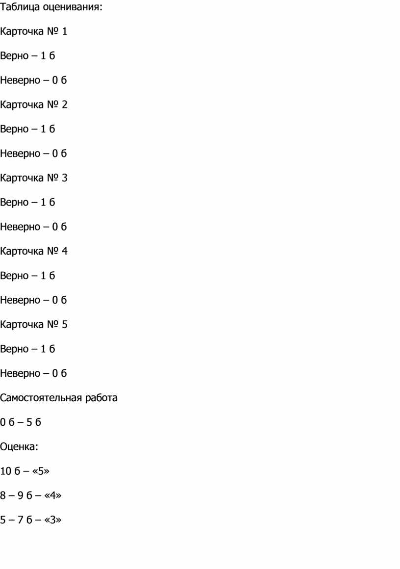 Затем 4 человека решают задания из карточки 5, остальные в это время решают задание из карточки 5 в тетрадях. Сверяем выполненное задание. Если задание выполнено верно, то в таблицу оценивания ставим 1 балл.