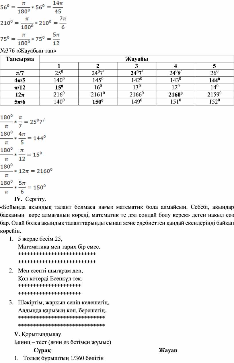 Тақырып: Бұрыштың градустық және радиандық өлшемдері тақырыбына есептер шығару