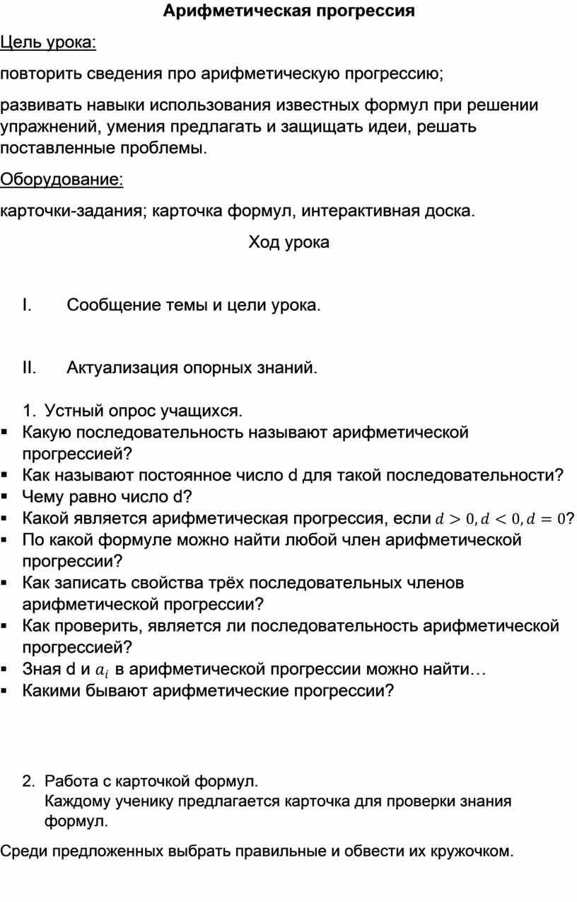 Пример урока в 9 классе по теме: «Арифметическая прогрессия» с использованием интерактивных технологий.