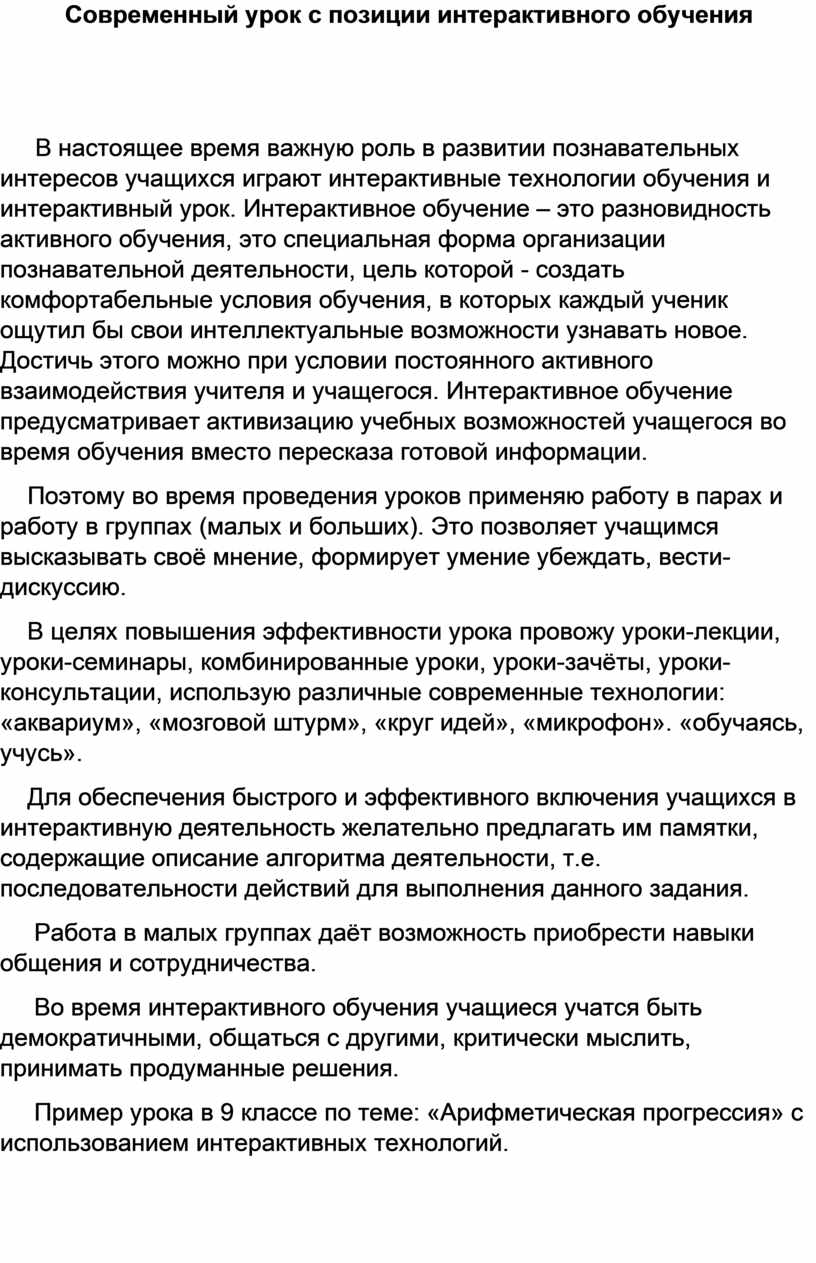 Современный урок с позиции интерактивного обучения