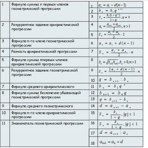 -Чтобы решить ту или иную задачу нужно знать определения и формулы, связывающие входящие в нее величины. Поэтому сейчас повторим сведения о прогрессиях. Установите соответствие между названием формулы и ее аналитической записью.