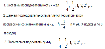 "Если, по-твоему, цена лошади высока, то купи её подковные гвозди, лошадь же получишь тогда в придачу бесплатно. Гвоздей в каждой подкове 6. За первый гвоздь дай мне 1/4 коп., за второй-1/2коп., за третий-1коп., и т.д.“