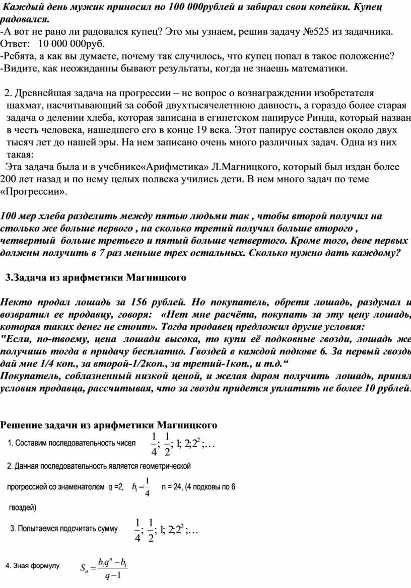 Эта задача была и в учебнике«Арифметика» Л.Магницкого, который был издан более 200 лет назад и по нему целых полвека учились дети. В нем много задач по теме «Прогрессии».