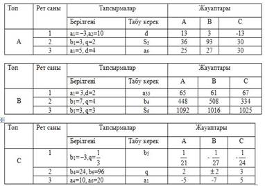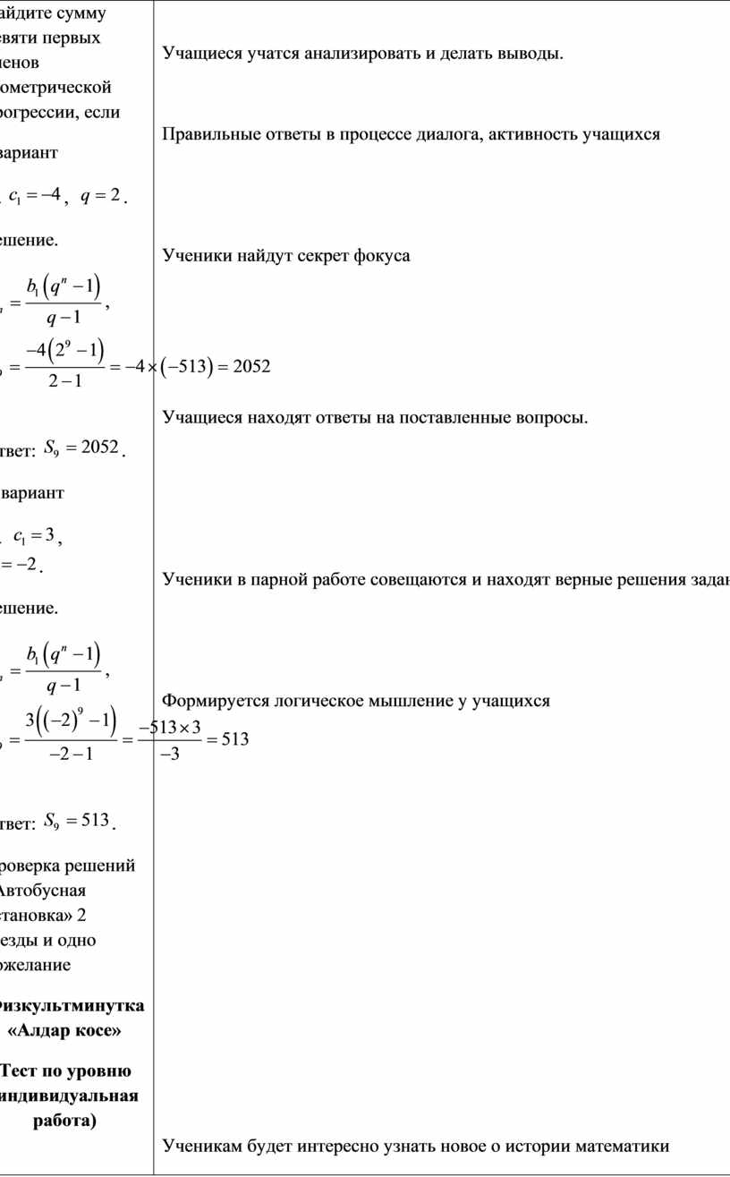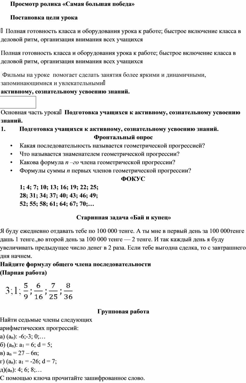 Цели и задачи урока: 1) образовательная: повторить материалы о геометрической и арифметической прогрессии 2) воспитательная: - воспитывать внимательность, интерес к изучаемому предмету, сообразительность; - воспитывать познавательный интерес к предмету и уверенность в своих силах; - воспитывать творческую самоответственность личности, стремящуюся к самореализации и составлению субъективности на всех этапах урока. 3) развивающая: -развивать логическое мышление учащихся, умение применять рациональные способы при решении задач. - развивать навыки самостоятельной работы, самоконтроля, самооценки; - развивать коммуникабельность, креативность, умение анализировать, обобщать, сравнивать, выделять главное |
