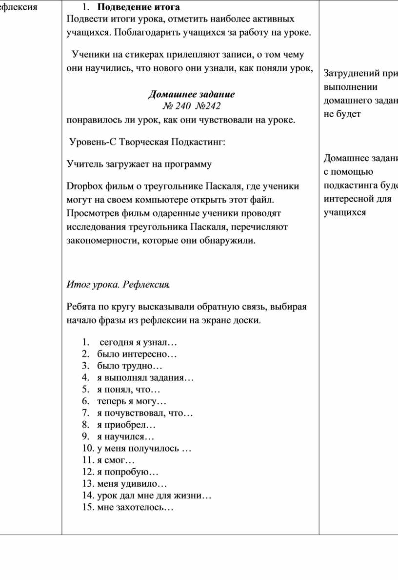 Уровень-С Творческая Подкастинг: Учитель загружает на программу Dropbox фильм о треугольнике Паскаля, где ученики могут на своем компьютере открыть этот файл. Просмотрев фильм одаренные ученики проводят исследования треугольника Паскаля, перечисляют закономерности, которые они обнаружили.