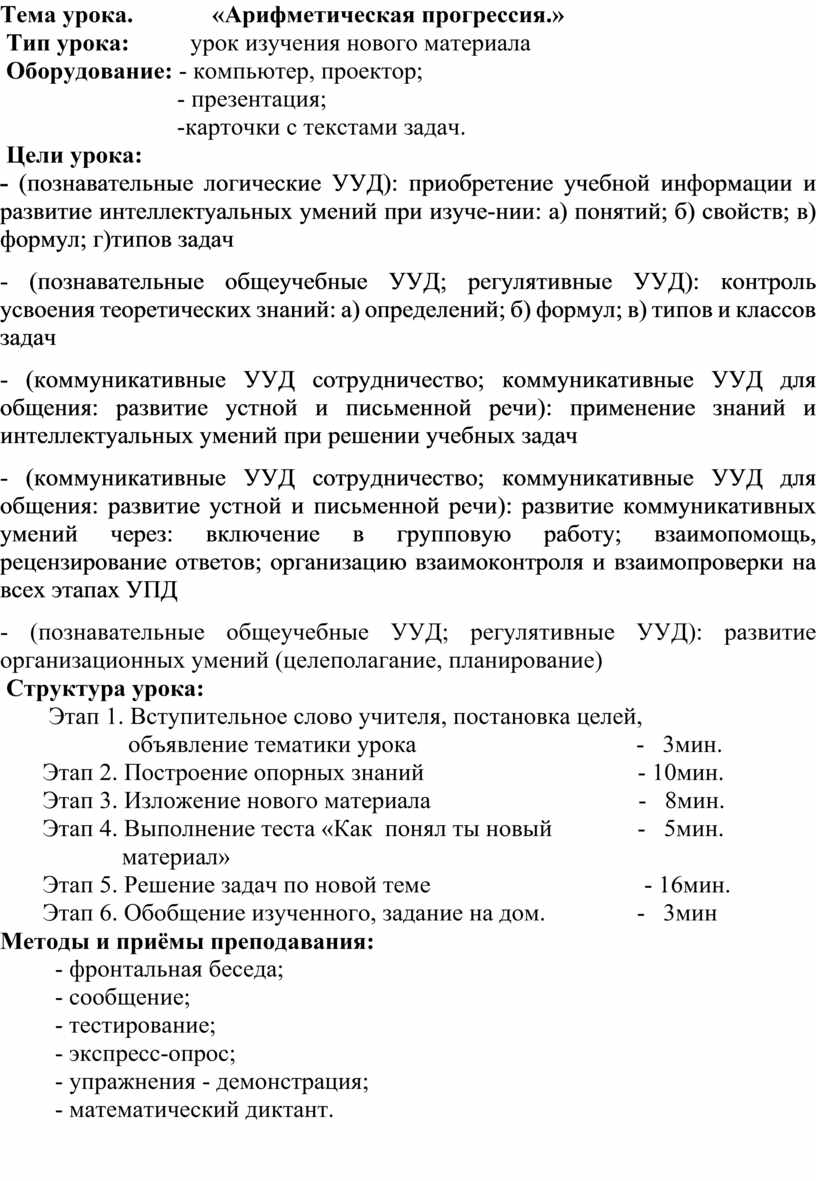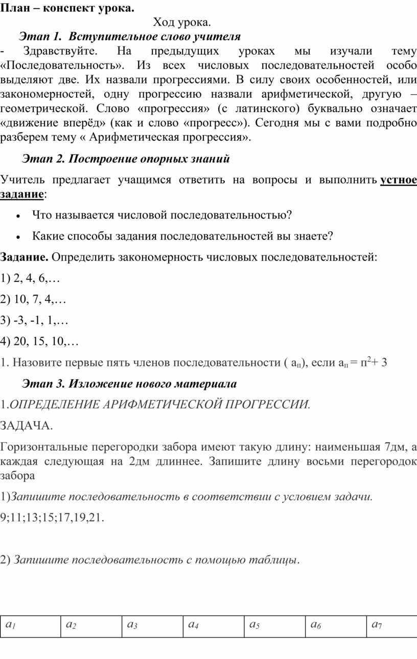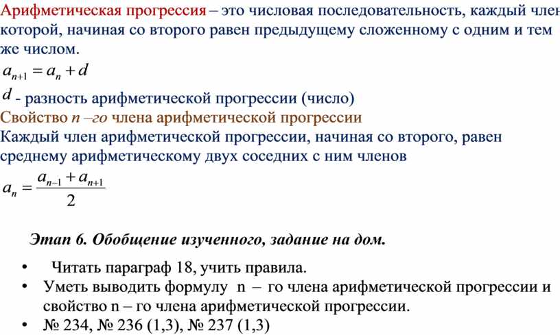 • Уметь выводить формулу n – го члена арифметической прогрессии и свойство n – го члена арифметической прогрессии.