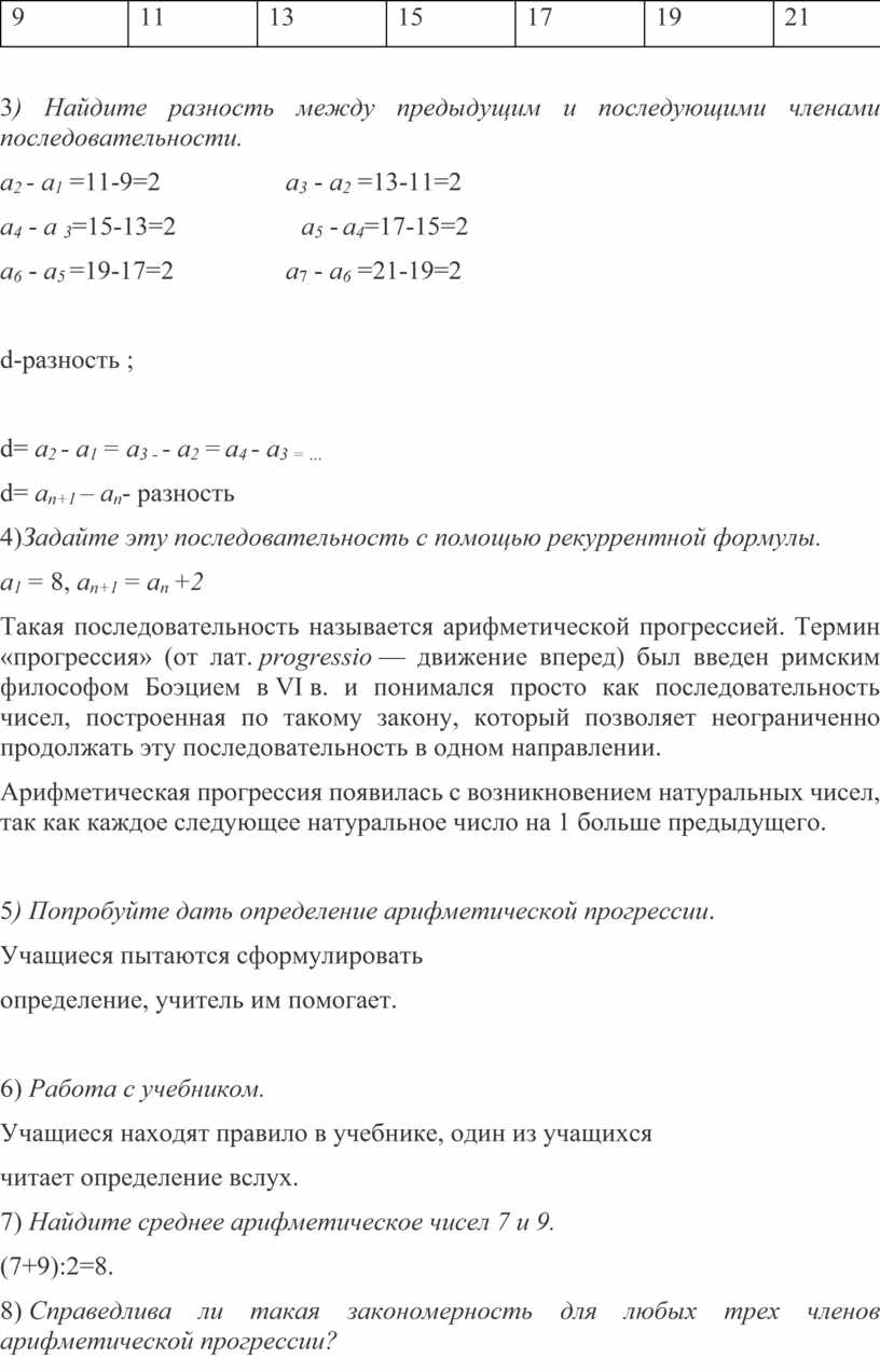 Такая последовательность называется арифметической прогрессией. Термин «прогрессия» (от лат. рrogressio — движение вперед) был введен римским философом Боэцием в VI в. и понимался просто как последовательность чисел, построенная по такому закону, который позволяет неограниченно продолжать эту последовательность в одном направлении.