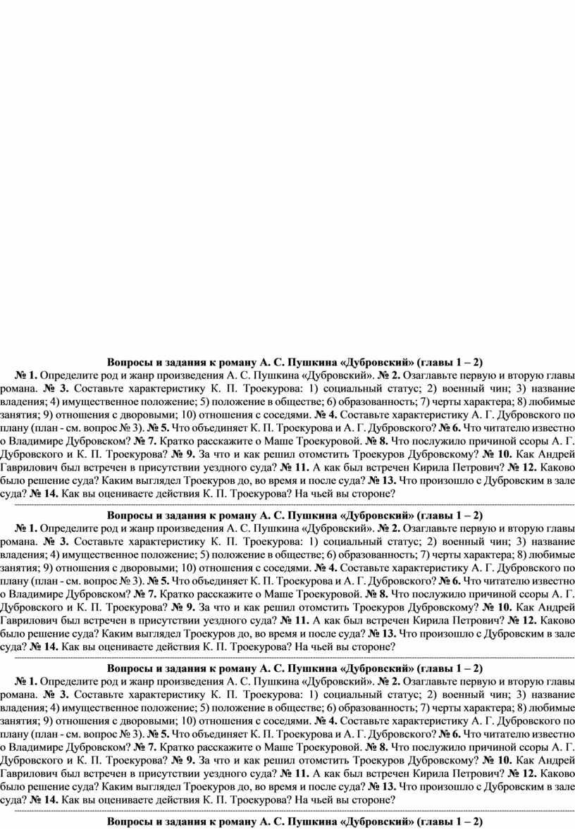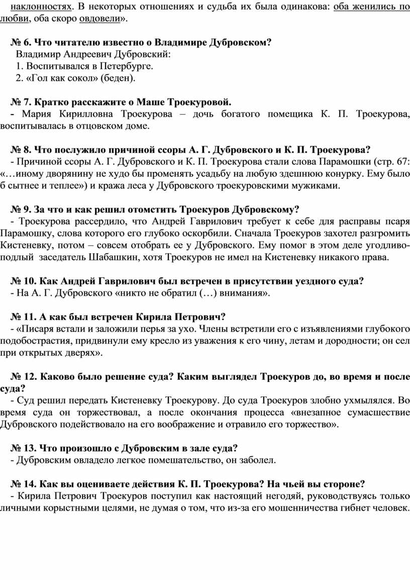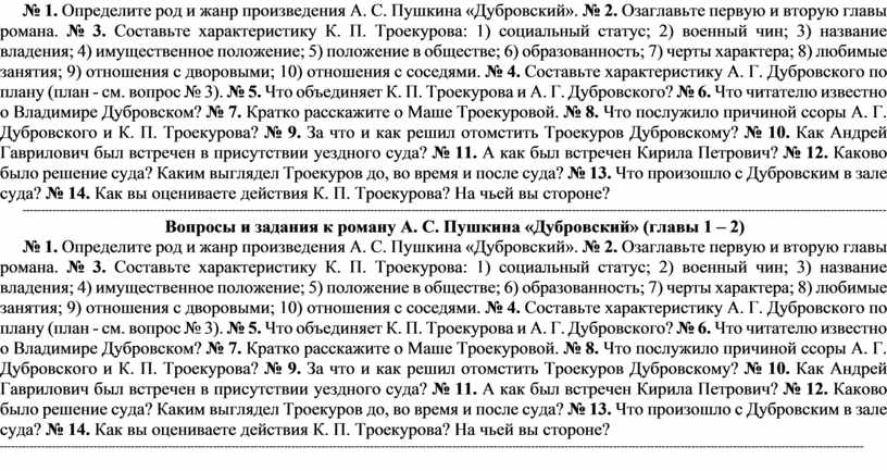 № 1. Определите род и жанр произведения А. С. Пушкина «Дубровский». № 2. Озаглавьте первую и вторую главы романа. № 3. Составьте характеристику К. П. Троекурова: 1) социальный статус; 2) военный чин; 3) название владения; 4) имущественное положение; 5) положение в обществе; 6) образованность; 7) черты характера; 8) любимые занятия; 9) отношения с дворовыми; 10) отношения с соседями. № 4. Составьте характеристику А. Г. Дубровского по плану (план - см. вопрос № 3). № 5. Что объединяет К. П. Троекурова и А. Г. Дубровского? № 6. Что читателю известно о Владимире Дубровском? № 7. Кратко расскажите о Маше Троекуровой. № 8. Что послужило причиной ссоры А. Г. Дубровского и К. П. Троекурова? № 9. За что и как решил отомстить Троекуров Дубровскому? № 10. Как Андрей Гаврилович был встречен в присутствии уездного суда? № 11. А как был встречен Кирила Петрович? № 12. Каково было решение суда? Каким выглядел Троекуров до, во время и после суда? № 13. Что произошло с Дубровским в зале суда? № 14. Как вы оцениваете действия К. П. Троекурова? На чьей вы стороне?