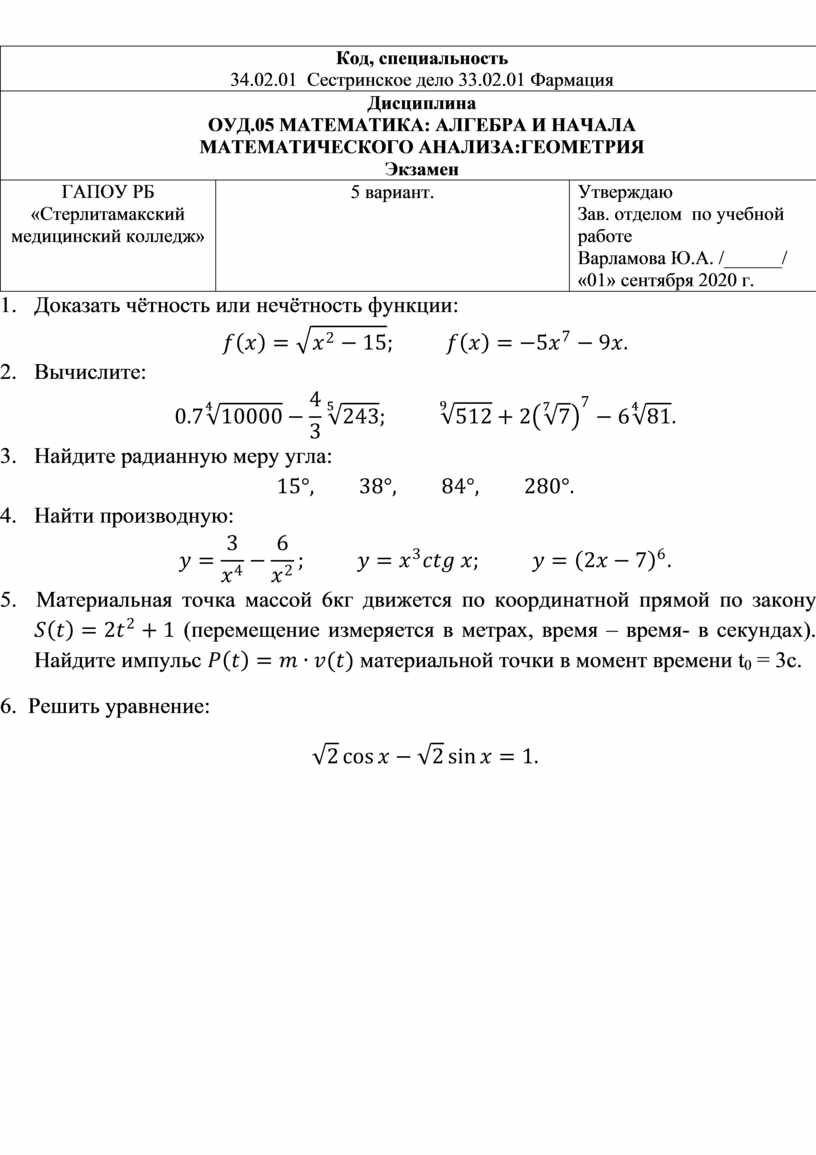 Дисциплина ОУД.05 МАТЕМАТИКА: АЛГЕБРА И НАЧАЛА МАТЕМАТИЧЕСКОГО АНАЛИЗА:ГЕОМЕТРИЯ Экзамен |